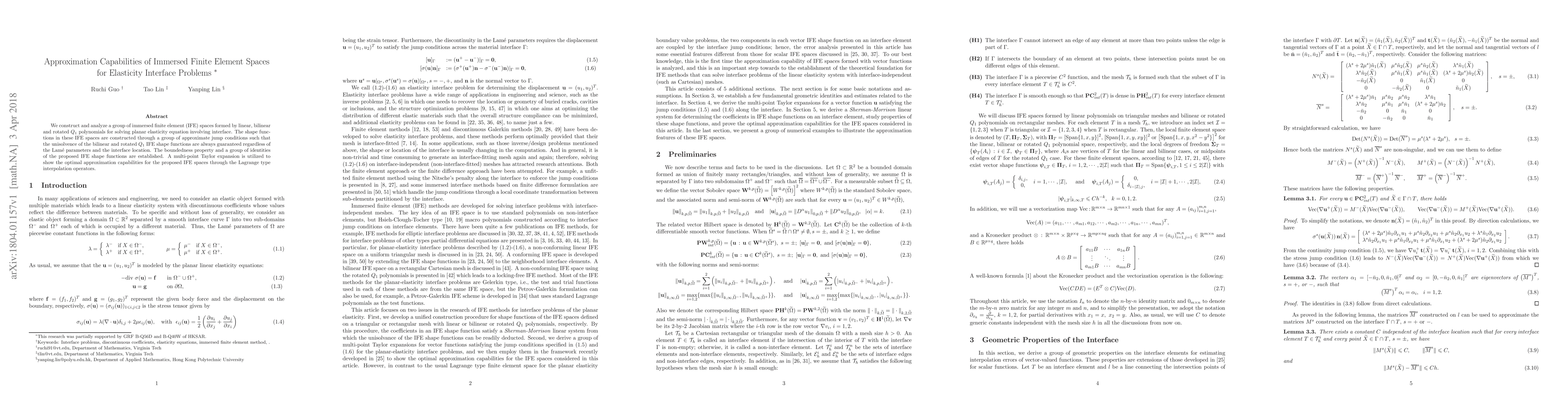 The paper constructs and analyzes immersed finite element (IFE) spaces using linear, bilinear, and rotated Q1 polynomials for solving planar elasticity problems involving interfaces. It guarantees unisolvence of bilinear and rotated Q1 IFE shape functions through approximate jump conditions, independent of Lamé parameters and interface location.