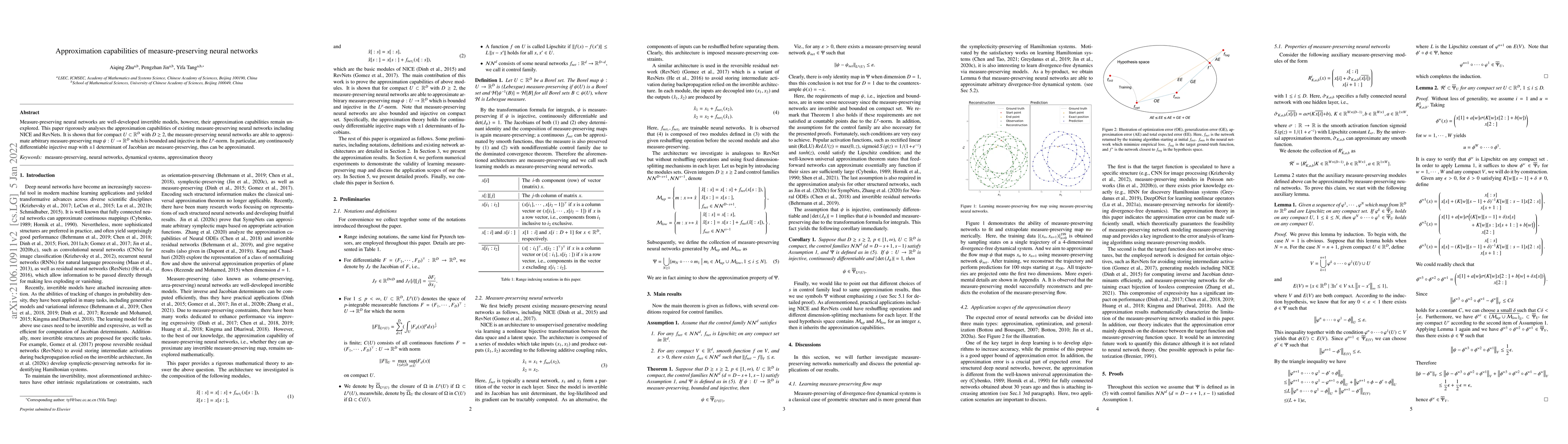This paper rigorously analyzes the approximation capabilities of measure-preserving neural networks, demonstrating their ability to approximate any bounded, injective, and continuously differentiable map with a determinant of $\pm 1$ on compact subsets of $\R^D$ for $D\geq 2$.