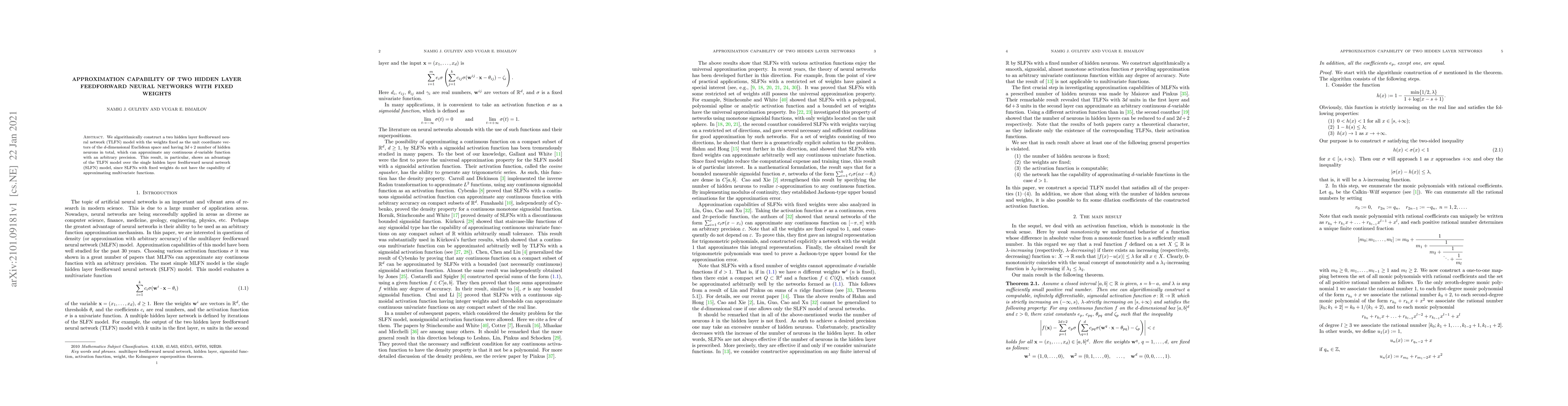 Summary: This paper constructs a two hidden layer feedforward neural network (TLFN) with fixed weights as unit coordinate vectors, capable of approximating any continuous $d$-variable function with arbitrary precision. This demonstrates TLFN's superior approximation capability over single hidden layer networks (SLFNs) with fixed weights, which cannot approximate multivariate functions.
