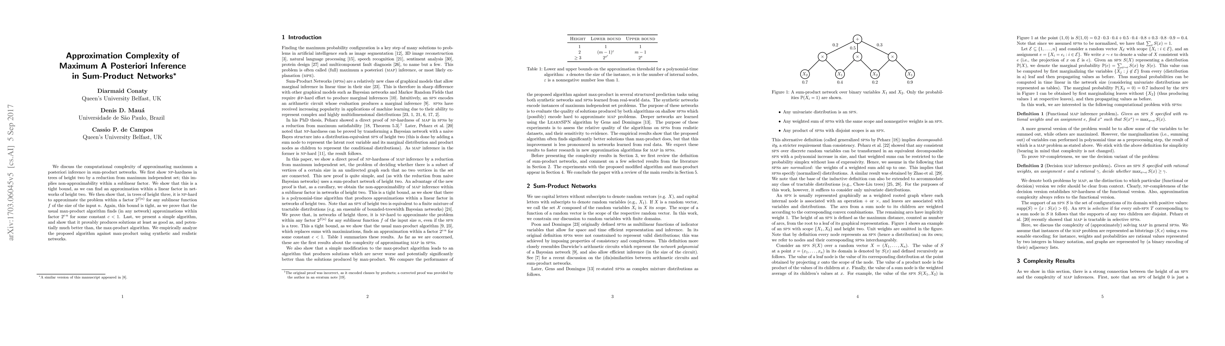 This paper explores the computational complexity of approximating maximum a posteriori inference in sum-product networks, demonstrating NP-hardness and non-approximability within sublinear factors for certain network heights. It also presents a new algorithm that potentially outperforms the standard max-product algorithm.