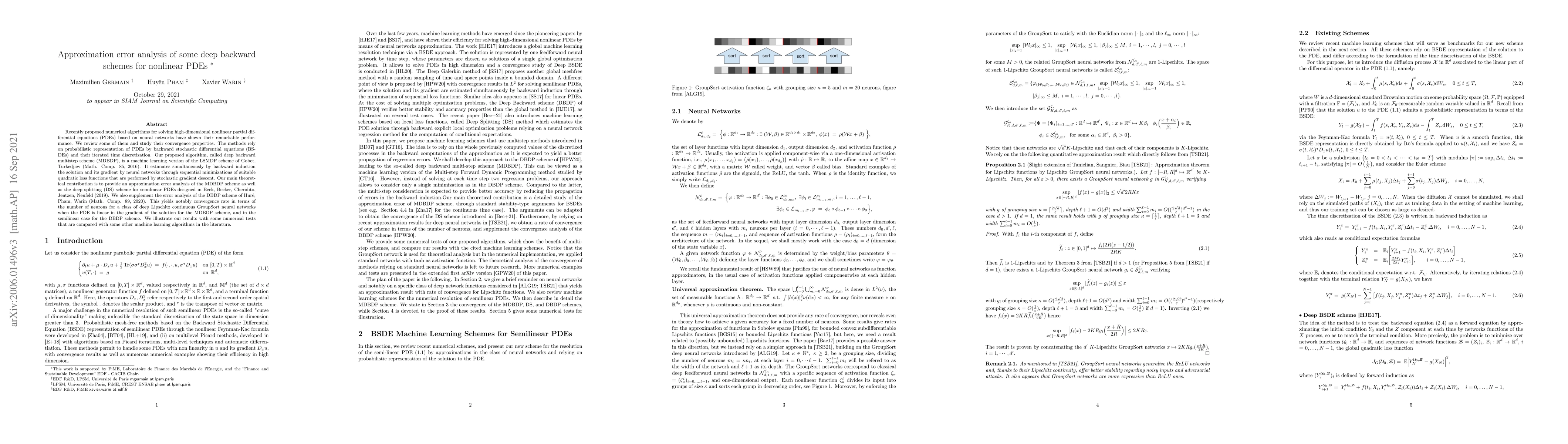 Recently proposed numerical algorithms for solving high-dimensional nonlinear partial differential equations (PDEs) based on neural networks have shown their remarkable performance. We review some of them and study their convergence properties. The methods rely on probabilistic representation of PDEs by backward stochastic differential equations (BSDEs) and their iterated time discretization. Our proposed algorithm, called deep backward multistep scheme (MDBDP), is a machine learning version of the LSMDP scheme of Gobet, Turkedjiev (Math. Comp. 85, 2016). It estimates simultaneously by backward induction the solution and its gradient by neural networks through sequential minimizations of suitable quadratic loss functions that are performed by stochastic gradient descent. Our main theoretical contribution is to provide an approximation error analysis of the MDBDP scheme as well as the deep splitting (DS) scheme for semilinear PDEs designed in Beck, Becker, Cheridito, Jentzen, Neufeld (2019). We also supplement the error analysis of the DBDP scheme of Hur{\'e}, Pham, Warin (Math. Comp. 89, 2020). This yields notably convergence rate in terms of the number of neurons for a class of deep Lipschitz continuous GroupSort neural networks when the PDE is linear in the gradient of the solution for the MDBDP scheme, and in the semilinear case for the DBDP scheme. We illustrate our results with some numerical tests that are compared with some other machine learning algorithms in the literature.