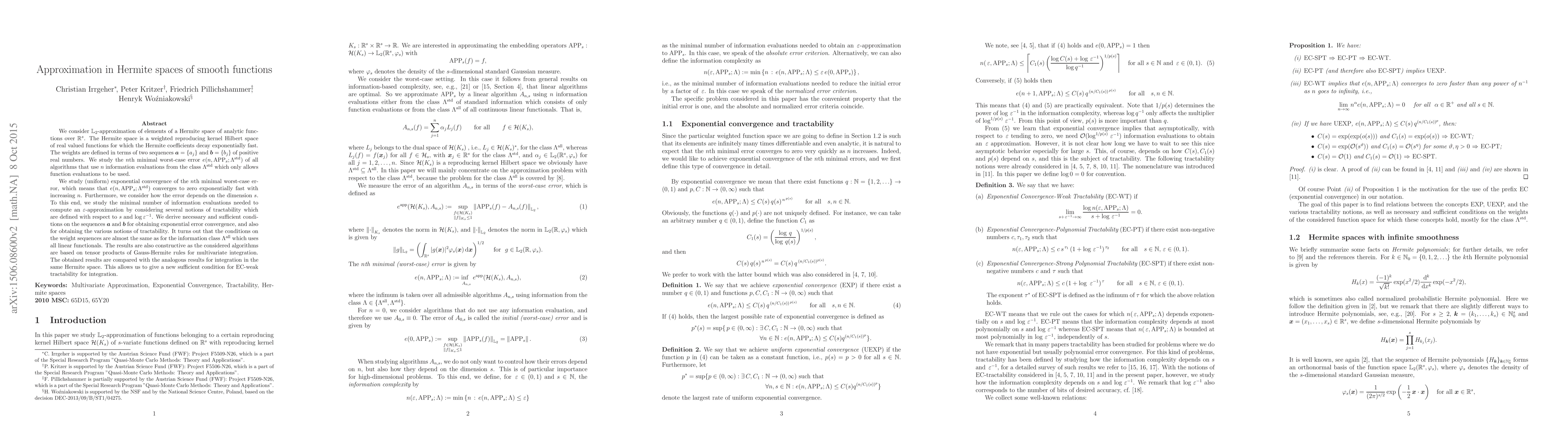 We consider $\mathbb{L}_2$-approximation of elements of a Hermite space of analytic functions over $\mathbb{R}^s$. The Hermite space is a weighted reproducing kernel Hilbert space of real valued functions for which the Hermite coefficients decay exponentially fast. The weights are defined in terms of two sequences $\boldsymbol{a} = \{a_j\}$ and $\boldsymbol{b} = \{b_j\}$ of positive real numbers. We study the $n$th minimal worst-case error $e(n,{\rm APP}_s;\Lambda^{{\rm std}})$ of all algorithms that use $n$ information evaluations from the class $\Lambda^{{\rm std}}$ which only allows function evaluations to be used. We study (uniform) exponential convergence of the $n$th minimal worst-case error, which means that $e(n,{\rm APP}_s; \Lambda^{{\rm std}})$ converges to zero exponentially fast with increasing $n$. Furthermore, we consider how the error depends on the dimension $s$. To this end, we study the minimal number of information evaluations needed to compute an $\varepsilon$-approximation by considering several notions of tractability which are defined with respect to $s$ and $\log \varepsilon^{-1}$. We derive necessary and sufficient conditions on the sequences $\boldsymbol{a}$ and $\boldsymbol{b}$ for obtaining exponential error convergence, and also for obtaining the various notions of tractability. It turns out that the conditions on the weight sequences are almost the same as for the information class $\Lambda^{{\rm all}}$ which uses all linear functionals. The results are also constructive as the considered algorithms are based on tensor products of Gauss-Hermite rules for multivariate integration. The obtained results are compared with the analogous results for integration in the same Hermite space. This allows us to give a new sufficient condition for EC-weak tractability for integration.