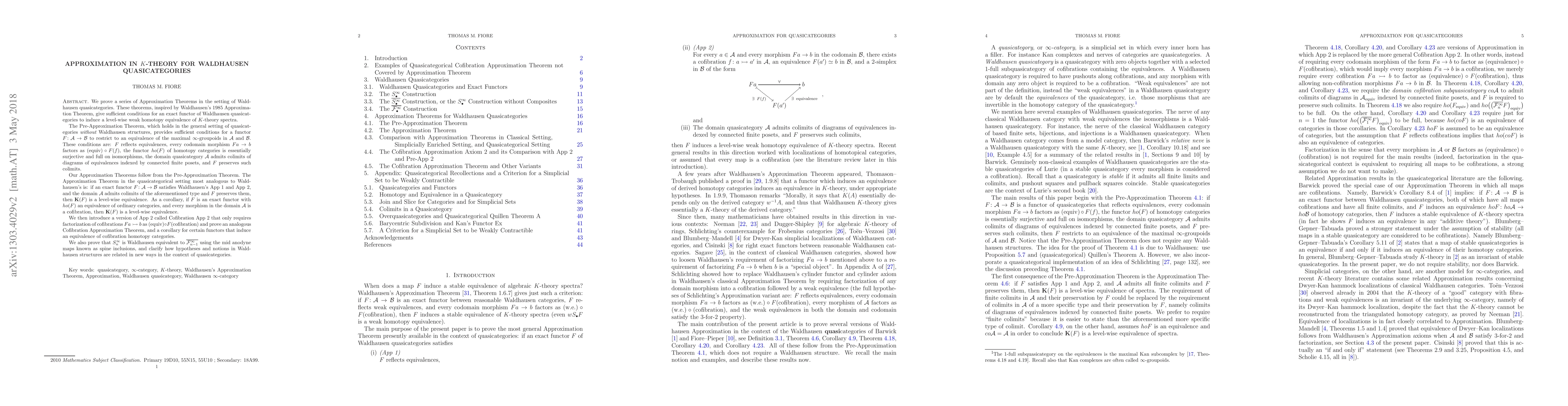 We prove a series of Approximation Theorems in the setting of Waldhausen quasicategories. These theorems, inspired by Waldhausen's 1985 Approximation Theorem, give sufficient conditions for an exact functor of Waldhausen quasicategories to induce a level-wise weak homotopy equivalence of K-theory spectra. The Pre-Approximation Theorem, which holds in the general setting of quasicategories without Waldhausen structures, provides sufficient conditions for a functor F:A->B to restrict to an equivalence of the maximal infinity-groupoids in A and B. Our Approximation Theorems follow from the Pre-Approximation Theorem. The Approximation Theorem in the quasicategorical setting most analogous to Waldhausen's is: if an exact functor F:A -> B satisfies Waldhausen's App 1 and App 2, and the domain A admits colimits of the aforementioned type and F preserves them, then K(F) is a level-wise equivalence. As a corollary, if F is an exact functor with ho(F) an equivalence of ordinary categories, and every morphism in the domain A is a cofibration, then K(F) is a level-wise equivalence. We then introduce a version of App 2 called Cofibration App 2 that only requires factorization of cofibrations Fa >-> b as (equiv) o F(cofibration) and prove an analogous Cofibration Approximation Theorem, and a corollary for certain functors that induce an equivalence of cofibration homotopy categories. We also prove that S_n^infinity is Waldhausen equivalent to \overline{\mathcal{F}_{n-1}^infinity} using the mid anodyne maps known as spine inclusions, and clarify how hypotheses and notions in Waldhausen structures are related in new ways in the context of quasicategories.