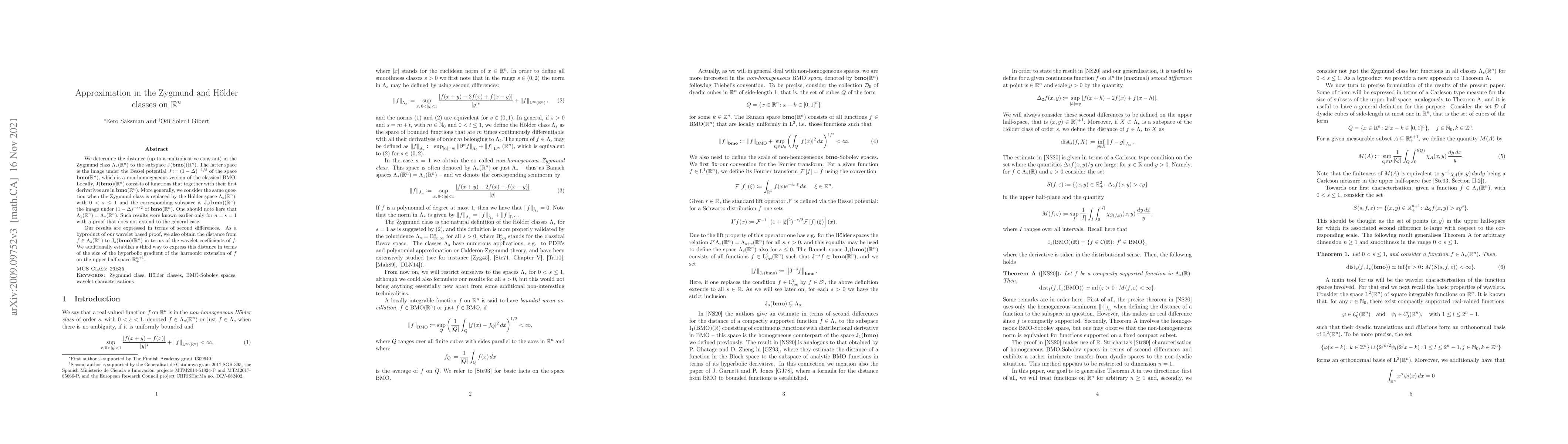 This paper determines the distance in the Zygmund and H\"older classes on $\mathbb{R}^n$ to the corresponding subspaces derived from $\mathbf{bmo}(\mathbb{R}^n)$ via Bessel potential. It provides new results for $n > 1$ and $s > 0$ using wavelet coefficients and hyperbolic gradient size.