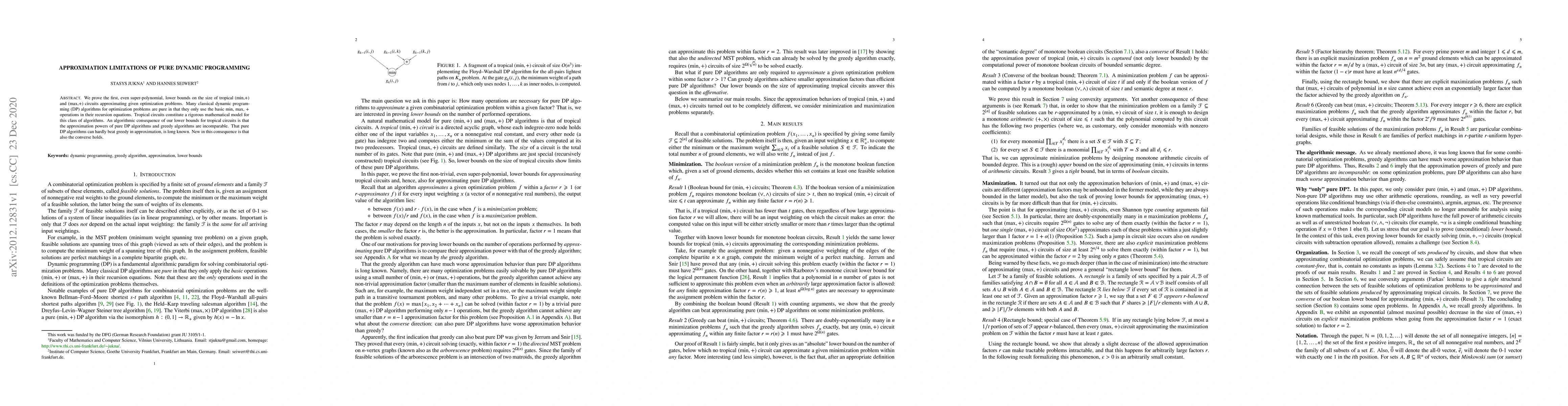 We prove the first, even super-polynomial, lower bounds on the size of tropical (min,+) and (max,+) circuits approximating given optimization problems. Many classical dynamic programming (DP) algorithms for optimization problems are pure in that they only use the basic min, max, + operations in their recursion equations. Tropical circuits constitute a rigorous mathematical model for this class of algorithms. An algorithmic consequence of our lower bounds for tropical circuits is that the approximation powers of pure DP algorithms and greedy algorithms are incomparable. That pure DP algorithms can hardly beat greedy in approximation, is long known. New in this consequence is that also the converse holds.