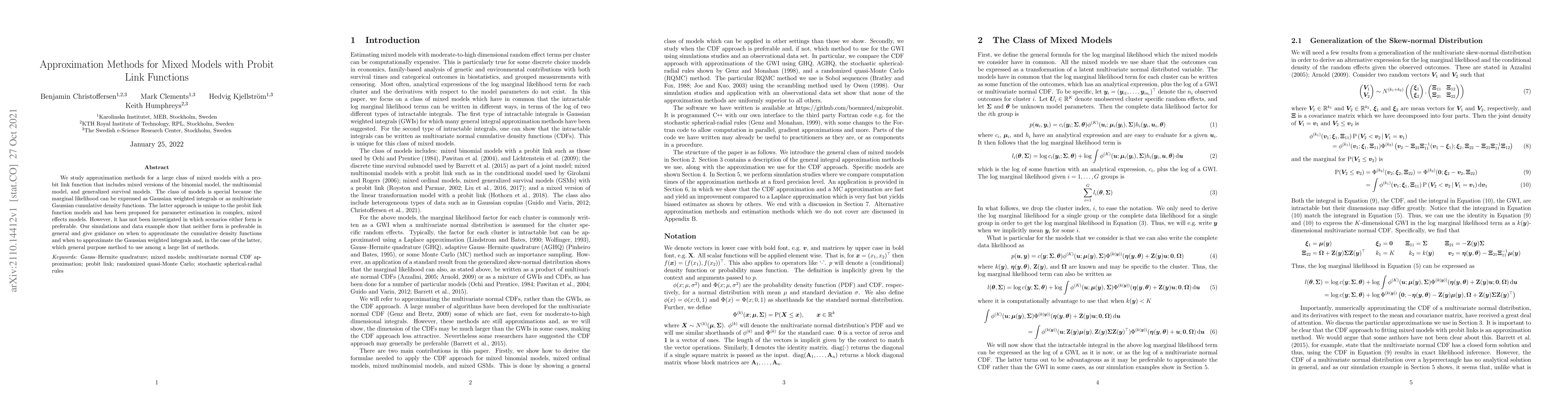 This paper investigates approximation methods for mixed models with probit link functions, comparing Gaussian weighted integrals and multivariate Gaussian cumulative density functions. Neither method is universally preferable, and the study provides guidance on their appropriate use based on simulation results and a data example.