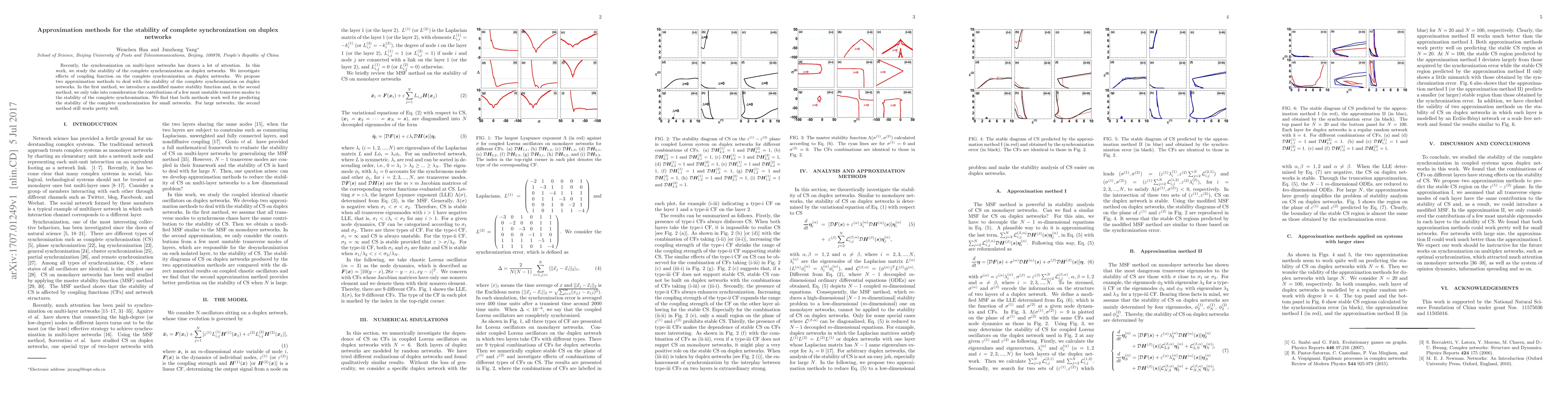 This research introduces two approximation methods to study the stability of complete synchronization in duplex networks. The first method modifies the master stability function, while the second focuses on the most unstable transverse modes. Both methods effectively predict stability for small networks, with the second method also performing well for larger networks.