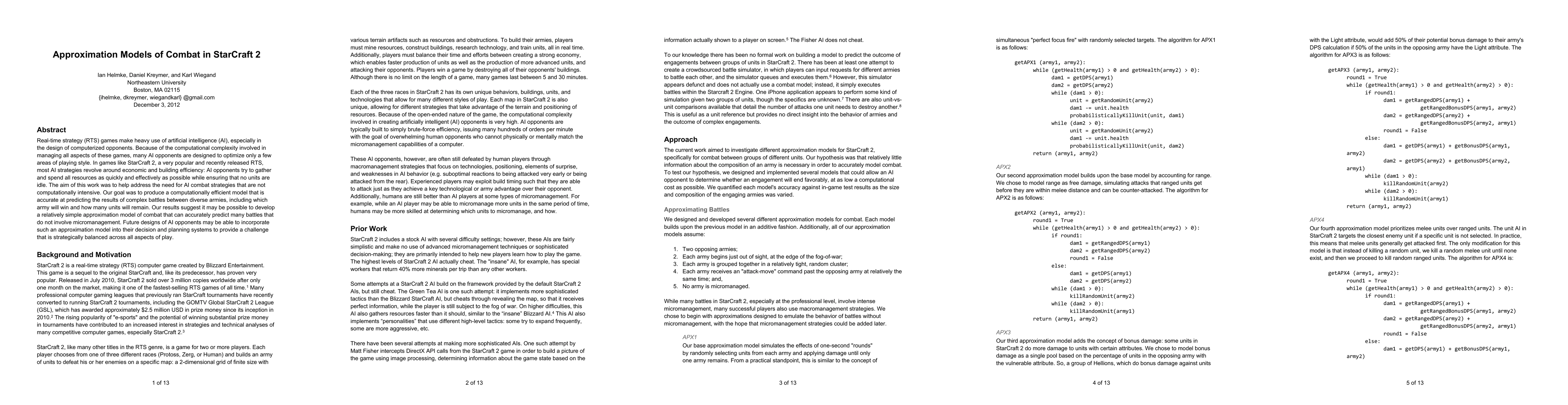 Real-time strategy (RTS) games make heavy use of artificial intelligence (AI), especially in the design of computerized opponents. Because of the computational complexity involved in managing all aspects of these games, many AI opponents are designed to optimize only a few areas of playing style. In games like StarCraft 2, a very popular and recently released RTS, most AI strategies revolve around economic and building efficiency: AI opponents try to gather and spend all resources as quickly and effectively as possible while ensuring that no units are idle. The aim of this work was to help address the need for AI combat strategies that are not computationally intensive. Our goal was to produce a computationally efficient model that is accurate at predicting the results of complex battles between diverse armies, including which army will win and how many units will remain. Our results suggest it may be possible to develop a relatively simple approximation model of combat that can accurately predict many battles that do not involve micromanagement. Future designs of AI opponents may be able to incorporate such an approximation model into their decision and planning systems to provide a challenge that is strategically balanced across all aspects of play.