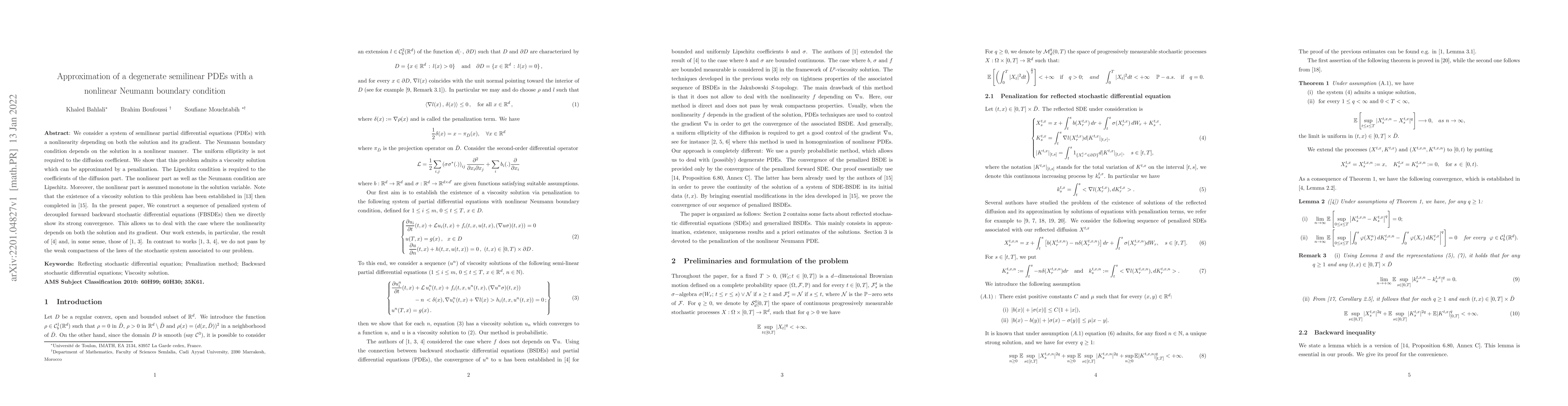 We consider a system of semilinear partial differential equations (PDEs) with a nonlinearity depending on both the solution and its gradient. The Neumann boundary condition depends on the solution in a nonlinear manner. The uniform ellipticity is not required to the diffusion coefficient. We show that this problem admits a viscosity solution which can be approximated by a penalization. The Lipschitz condition is required to the coefficients of the diffusion part. The nonlinear part as well as the Neumann condition are Lipschitz. Moreover, the nonlinear part is assumed monotone in the solution variable. Note that the existence of a viscosity solution to this problem has been established in [13] then completed in [15]. In the present paper, We construct a sequence of penalized system of decoupled forward backward stochastic differential equations (FBSDEs) then we directly show its strong convergence. This allows us to deal with the case where the nonlinearity depends on both the solution and its gradient. Our work extends, in particular, the result of [4] and, in some sense, those of [1, 3]. In contrast to works [1, 3, 4], we do not pass by the weak compactness of the laws of the stochastic system associated to our problem.