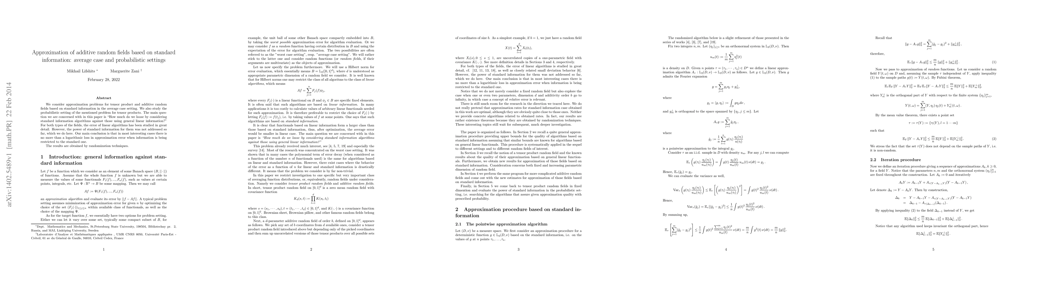 This paper investigates the approximation of tensor product and additive random fields using standard information in average case and probabilistic settings. It concludes that restricting to standard information algorithms results in no more than a logarithmic loss in approximation error compared to general linear information, achieved through randomization techniques.