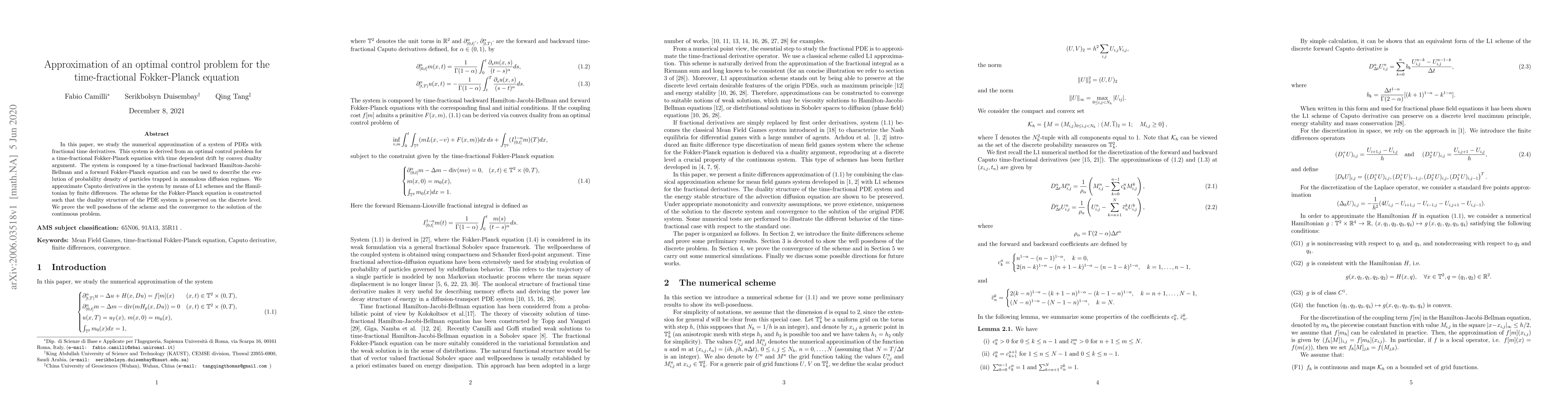 This paper develops a numerical scheme for approximating a system of PDEs with fractional time derivatives derived from an optimal control problem for a time-fractional Fokker-Planck equation. The scheme preserves the duality structure and proves well-posedness and convergence to the continuous solution.