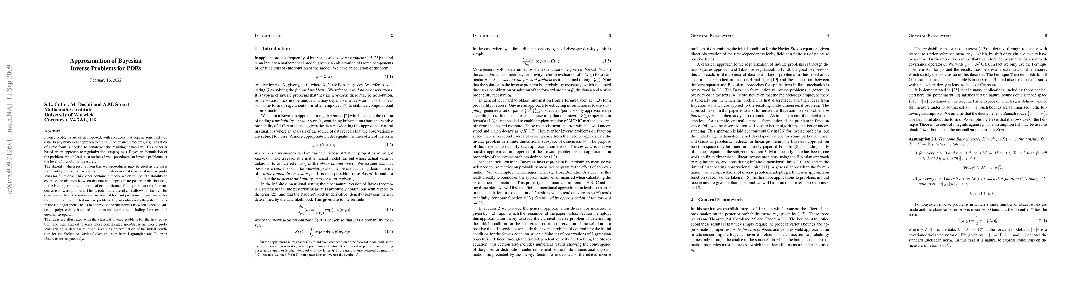 Inverse problems are often ill-posed, with solutions that depend sensitively on data. In any numerical approach to the solution of such problems, regularization of some form is needed to counteract the resulting instability. This paper is based on an approach to regularization, employing a Bayesian formulation of the problem, which leads to a notion of well-posedness for inverse problems, at the level of probability measures. The stability which results from this well-posedness may be used as the basis for quantifying the approximation, in finite dimensional spaces, of inverse problems for functions. This paper contains a theory which utilizes the stability to estimate the distance between the true and approximate posterior distributions, in the Hellinger metric, in terms of error estimates for approximation of the underlying forward problem. This is potentially useful as it allows for the transfer of estimates from the numerical analysis of forward problems into estimates for the solution of the related inverse problem. In particular controlling differences in the Hellinger metric leads to control on the differences between expected values of polynomially bounded functions and operators, including the mean and covariance operator. The ideas are illustrated with the classical inverse problem for the heat equation, and then applied to some more complicated non-Gaussian inverse problems arising in data assimilation, involving determination of the initial condition for the Stokes or Navier-Stokes equation from Lagrangian and Eulerian observations respectively.