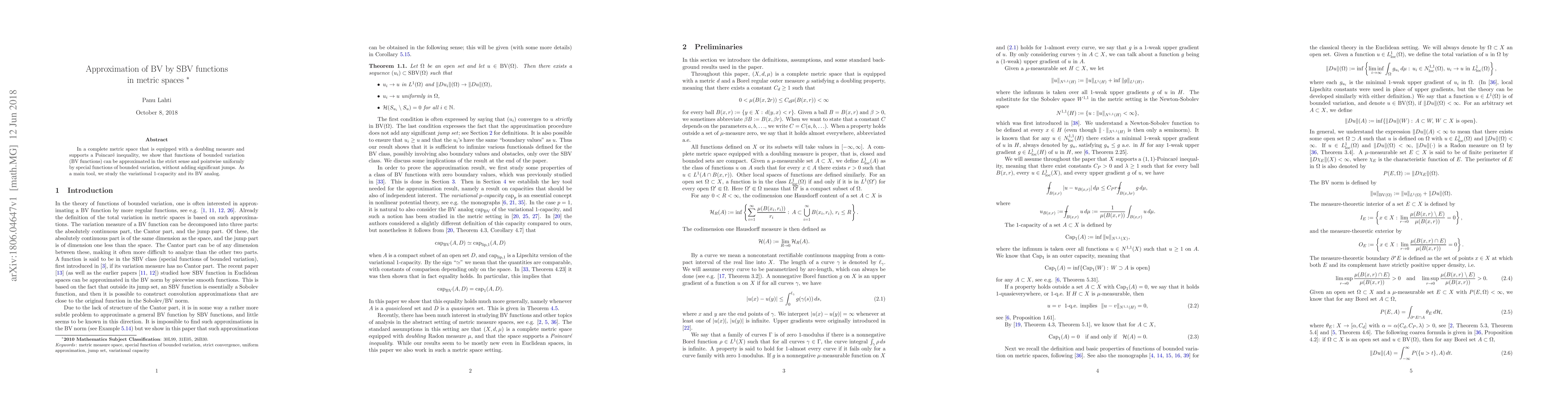 In a complete metric space that is equipped with a doubling measure and supports a Poincar\'e inequality, we show that functions of bounded variation (BV functions) can be approximated in the strict sense and pointwise uniformly by special functions of bounded variation, without adding significant jumps. As a main tool, we study the variational 1-capacity and its BV analog.