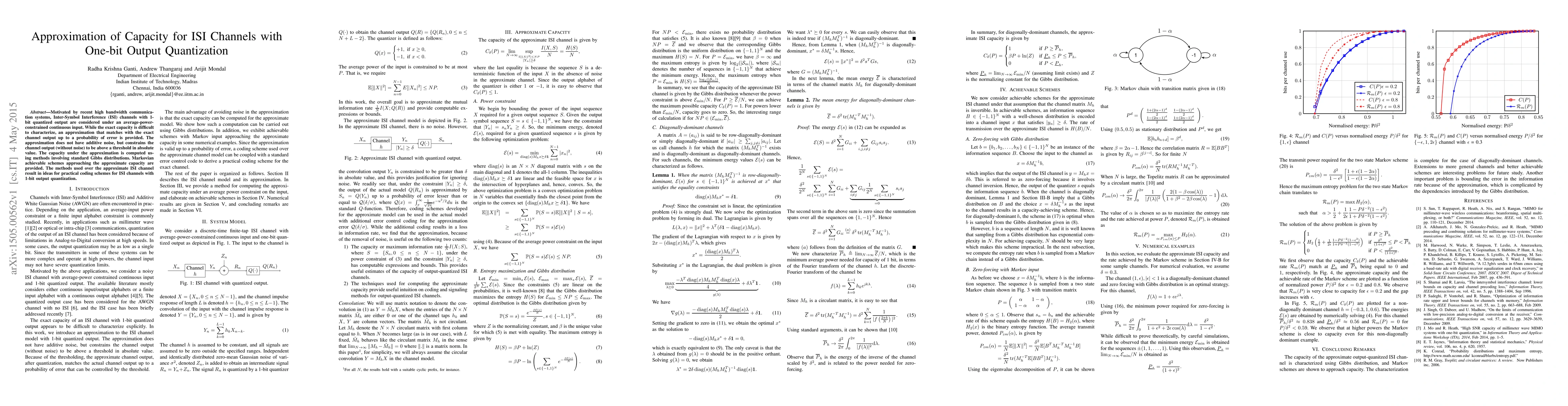 Motivated by recent high bandwidth communication systems, Inter-Symbol Interference (ISI) channels with 1-bit quantized output are considered under an average-power-constrained continuous input. While the exact capacity is difficult to characterize, an approximation that matches with the exact channel output up to a probability of error is provided. The approximation does not have additive noise, but constrains the channel output (without noise) to be above a threshold in absolute value. The capacity under the approximation is computed using methods involving standard Gibbs distributions. Markovian achievable schemes approaching the approximate capacity are provided. The methods used over the approximate ISI channel result in ideas for practical coding schemes for ISI channels with 1-bit output quantization.