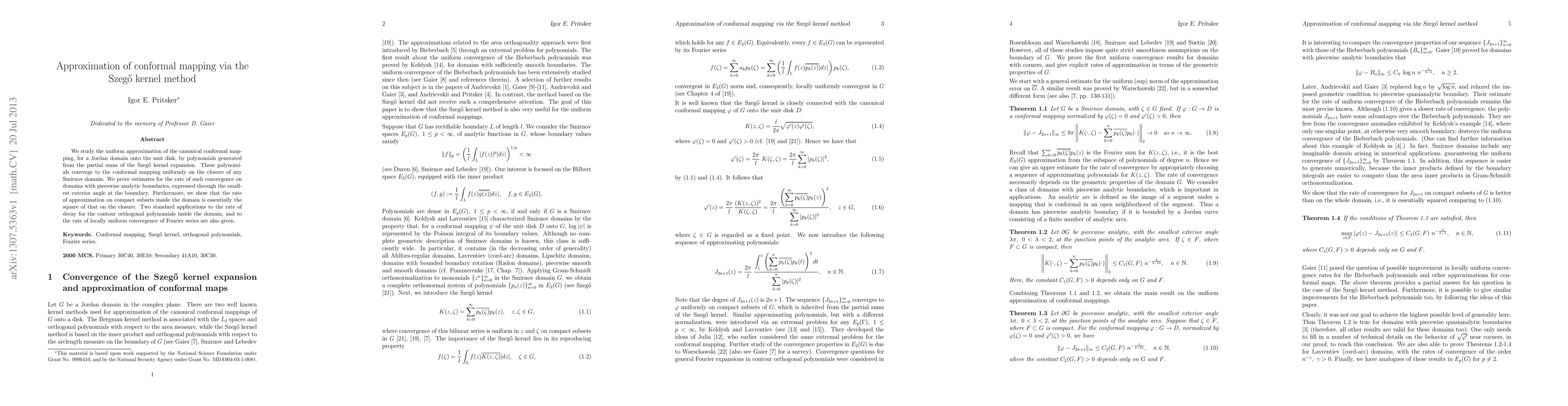 This paper investigates the uniform approximation of conformal mappings for Jordan domains onto the unit disk using polynomials derived from the Szegő kernel. It demonstrates that these polynomials converge uniformly to the conformal mapping on Smirnov domains and provides estimates for the convergence rate based on the smallest exterior angle of the domain's boundary.