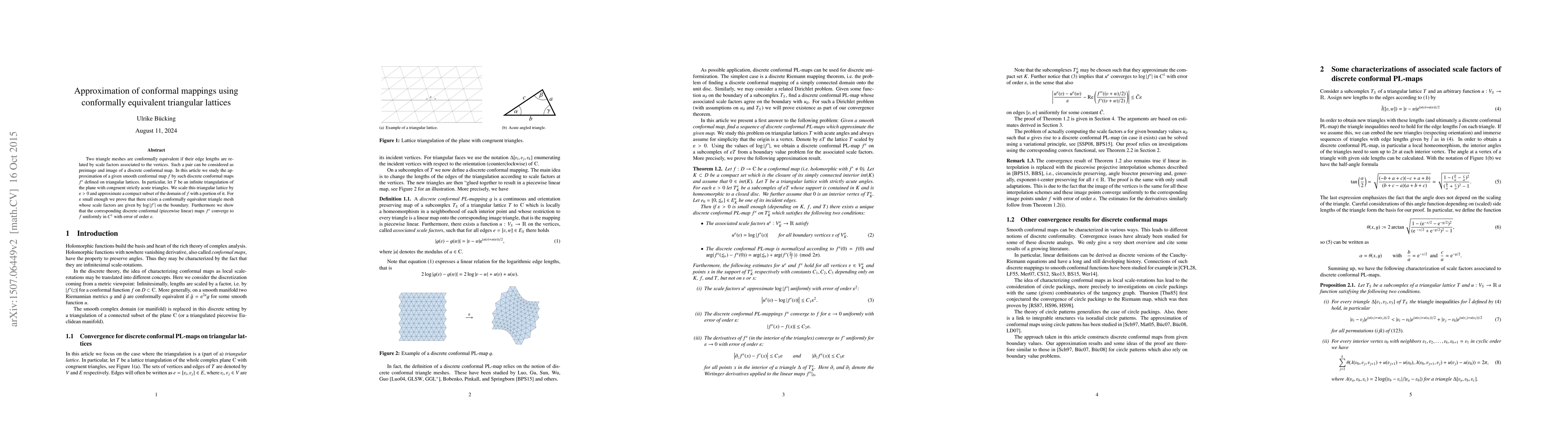 Consider discrete conformal maps defined on the basis of two conformally equivalent triangle meshes, that is edge lengths are related by scale factors associated to the vertices. Given a smooth conformal map $f$, we show that it can be approximated by such discrete conformal maps $f^\epsilon$. In particular, let $T$ be an infinite regular triangulation of the plane with congruent triangles and only acute angles (i.e.\ $<\pi/2$). We scale this tiling by $\epsilon>0$ and approximate a compact subset of the domain of $f$ with a portion of it. For $\epsilon$ small enough we prove that there exists a conformally equivalent triangle mesh whose scale factors are given by $\log|f'|$ on the boundary. Furthermore we show that the corresponding discrete conformal maps $f^\epsilon$ converge to $f$ uniformly in $C^1$ with error of order $\epsilon$.