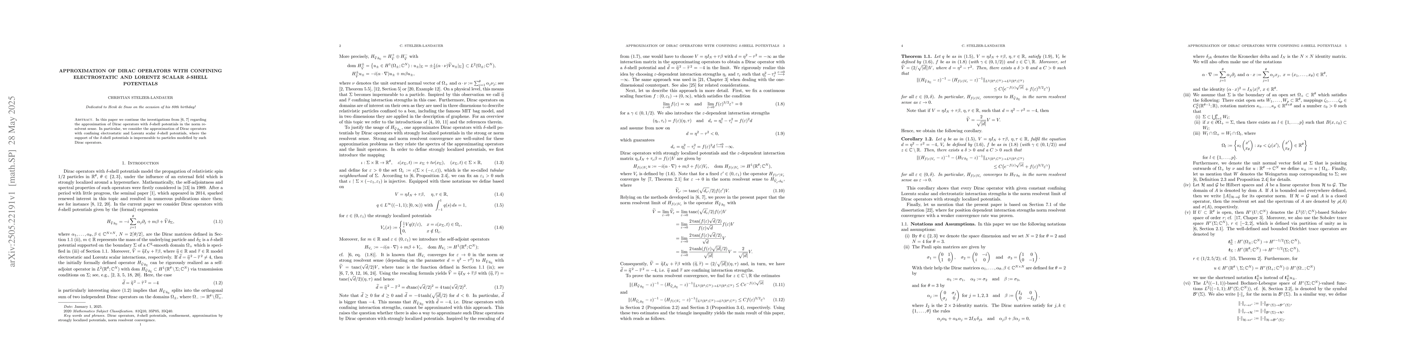 The paper presents a method for approximating Dirac operators with $\delta$-shell potentials, providing a theoretical framework for understanding particle confinement under electrostatic and Lorentz scalar conditions.