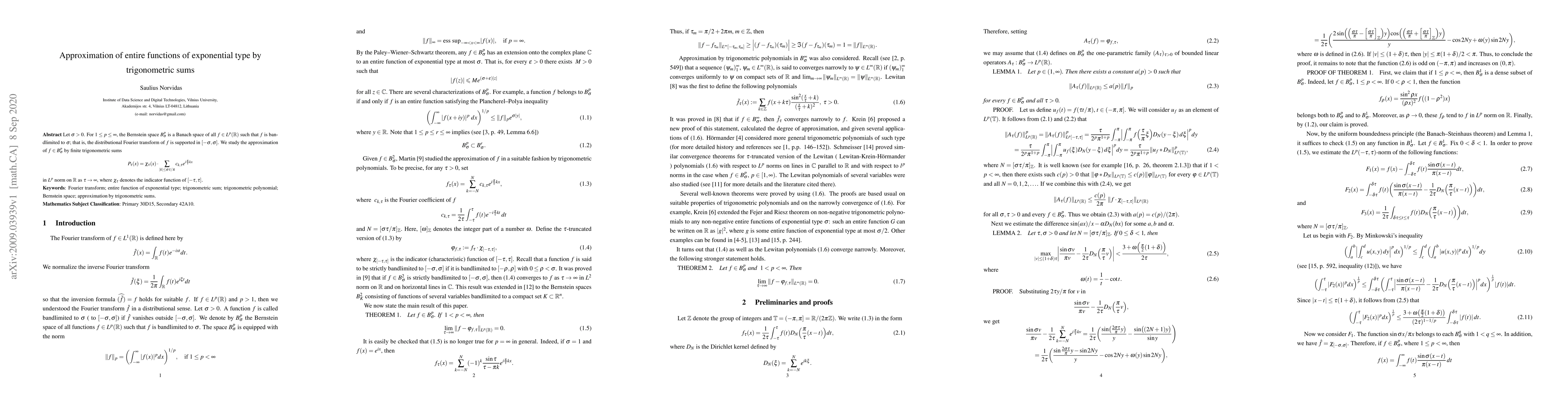 The paper explores how well trigonometric sums can approximate functions of exponential type in the Bernstein space $B^p_{ u}$ as $ au$ approaches infinity. The results show that such approximations improve as $ au$ increases.