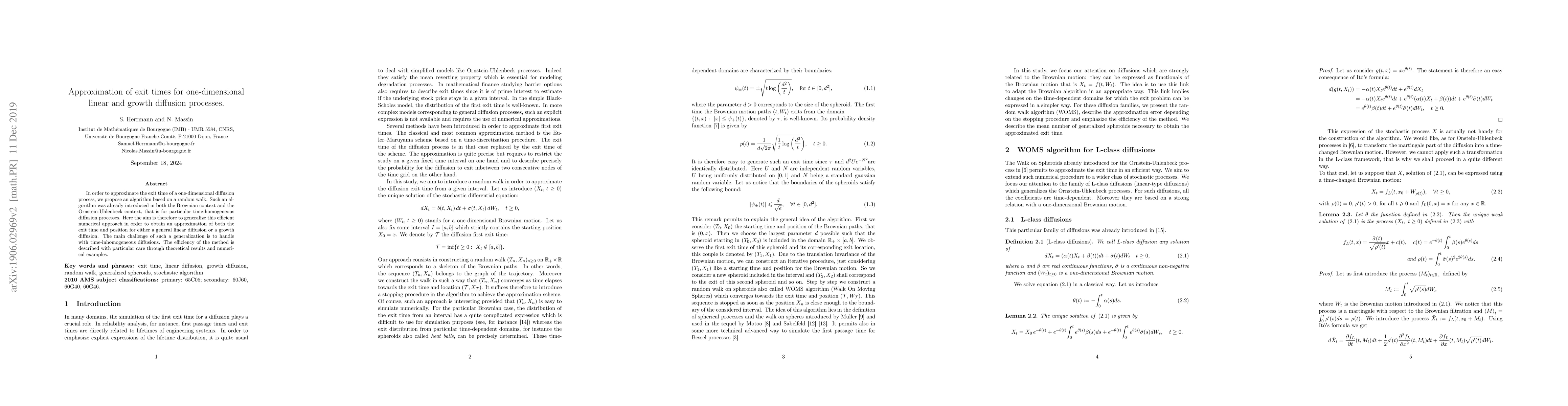 This paper proposes a random walk-based algorithm to approximate the exit time and position for one-dimensional linear and growth diffusion processes. The method generalizes existing efficient numerical approaches and is validated through theoretical analysis and numerical examples.
