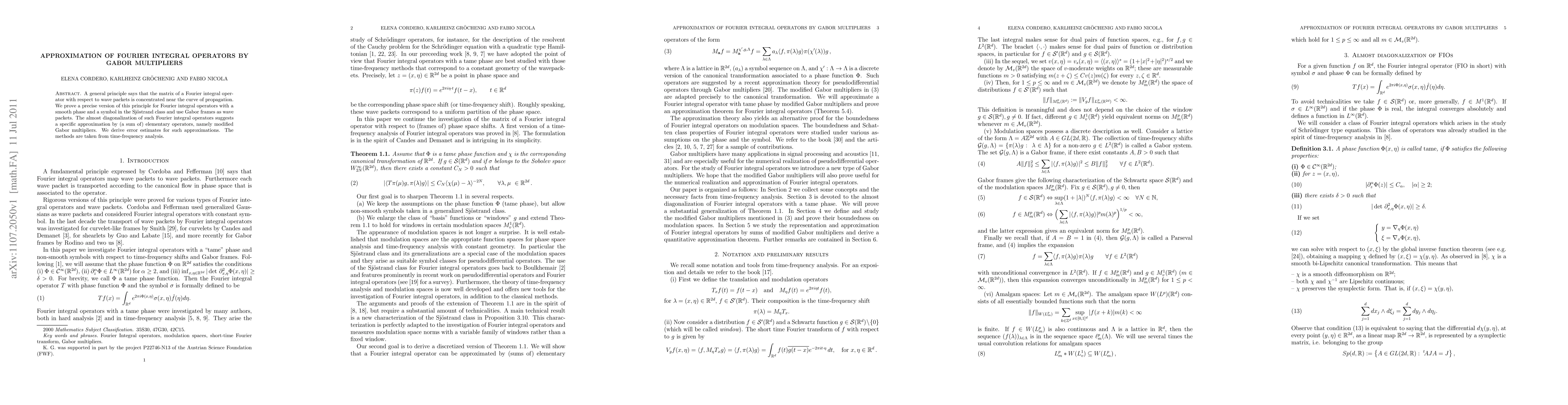 This paper proves a precise version of the principle that Fourier integral operators are concentrated near the curve of propagation, using Gabor frames as wave packets. It then approximates these operators with modified Gabor multipliers and provides error estimates, employing techniques from time-frequency analysis.