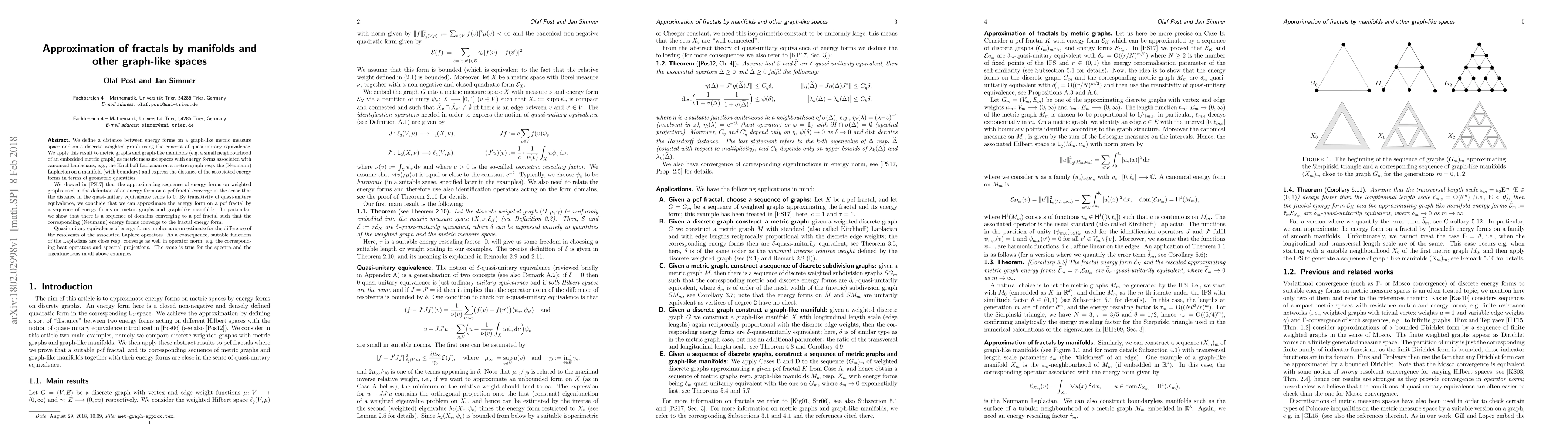 We define a distance between energy forms on a graph-like metric measure space and on a discrete weighted graph using the concept of quasi-unitary equivalence. We apply this result to metric graphs and graph-like manifolds (e.g. a small neighbourhood of an embedded metric graph) as metric measure spaces with energy forms associated with canonical Laplacians, e.g., the Kirchhoff Laplacian on a metric graph resp. the (Neumann) Laplacian on a manifold (with boundary) and express the distance of the associated energy forms in terms of geometric quantities. We showed in arXiv:1704.00064 that the approximating sequence of energy forms on weighted graphs used in the definition of an energy form on a pcf fractal converge in the sense that the distance in the quasi-unitary equivalence tends to 0. By transitivity of quasi-unitary equivalence, we conclude that we can approximate the energy form on a pcf fractal by a sequence of energy forms on metric graphs and graph-like manifolds. In particular, we show that there is a sequence of domains converging to a pcf fractal such that the corresponding (Neumann) energy forms converge to the fractal energy form. Quasi-unitary equivalence of energy forms implies a norm estimate for the difference of the resolvents of the associated Laplace operators. As a consequence, suitable functions of the Laplacians are close resp. converge as well in operator norm, e.g. the corresponding heat operators and spectral projections. The same is true for the spectra and the eigenfunctions in all above examples.