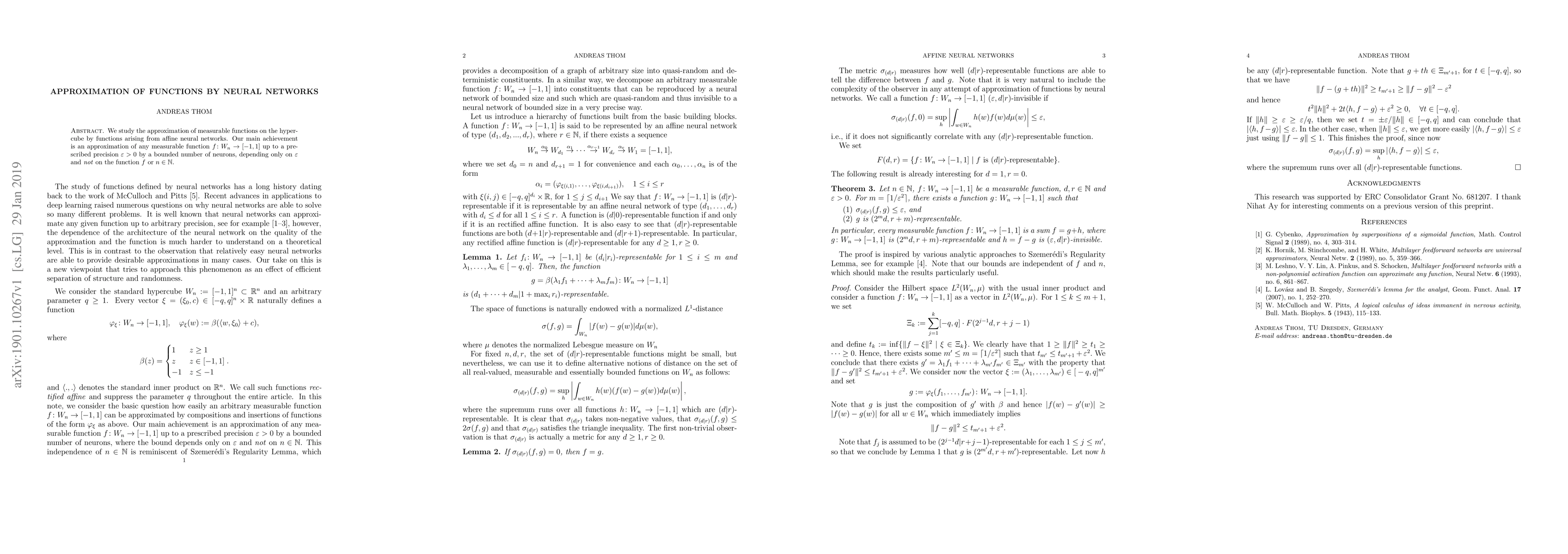 We study the approximation of measurable functions on the hypercube by functions arising from affine neural networks. Our main achievement is an approximation of any measurable function $f \colon W_n \to [-1,1]$ up to a prescribed precision $\varepsilon>0$ by a bounded number of neurons, depending only on $\varepsilon$ and not on the function $f$ or $n \in \mathbb N$.