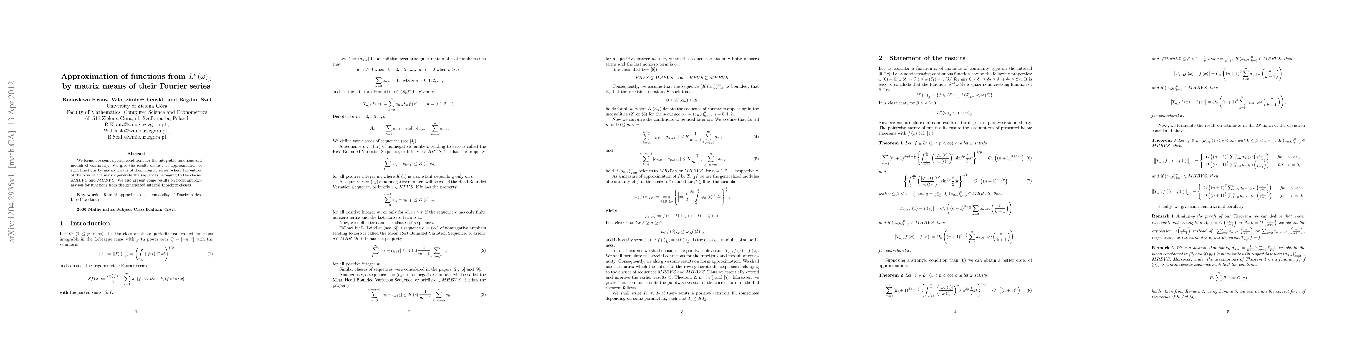We formulate some special conditions for the integrable functions and moduli of continuity. We give the results on rate of approximation of such functions by matrix means of their Fourier series, where the entries of the rows of the matrix generate the sequences belonging to the classes MRBVS and MHBVS. We also present some results on norm approximation for functions from the generalized integral Lipschitz classes.