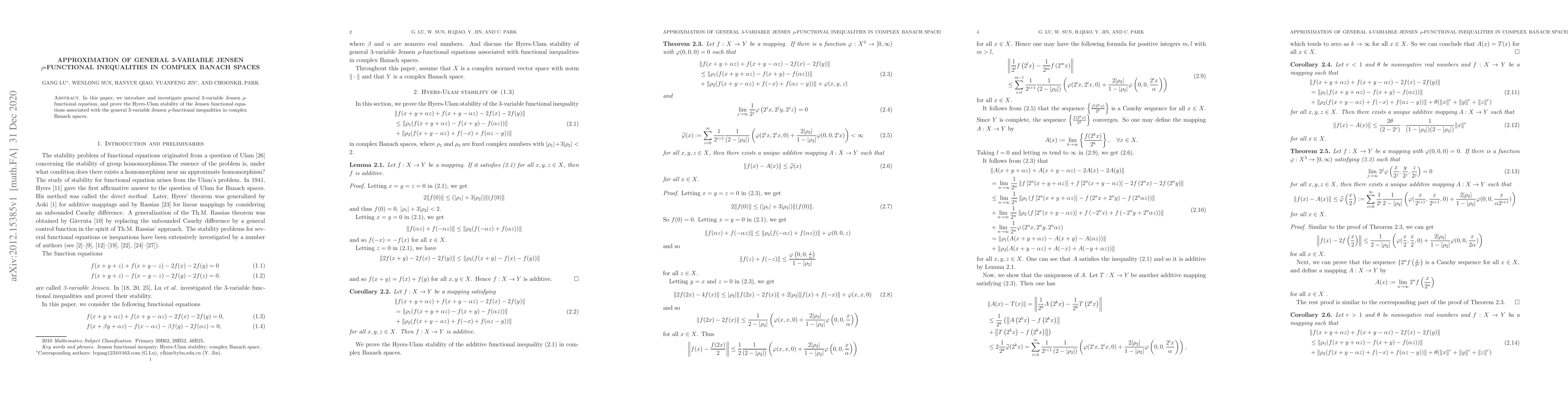 This paper explores the general 3-variable Jensen $\rho$-functional equation and demonstrates the Hyers-Ulam stability of associated functional inequalities in complex Banach spaces. The study provides an approximation of these inequalities.