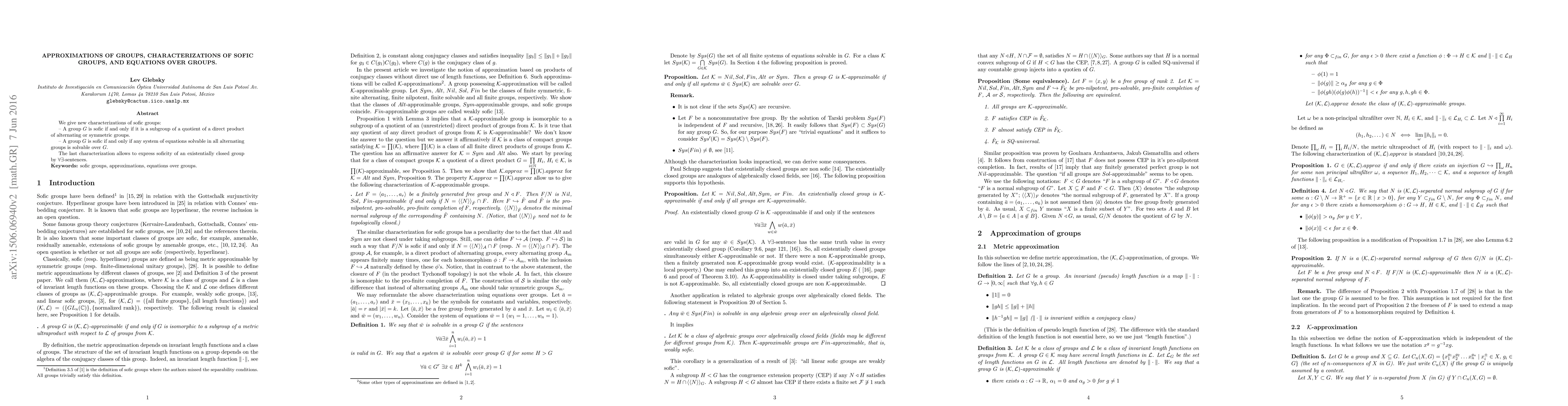 Summary: This paper provides new characterizations of sofic groups, showing they are subgroups of quotients of direct products of alternating or symmetric groups and that they solve any system of equations solvable in all alternating groups. It also demonstrates how soficity of existentially closed groups can be expressed via $\forall\exists$-sentences.