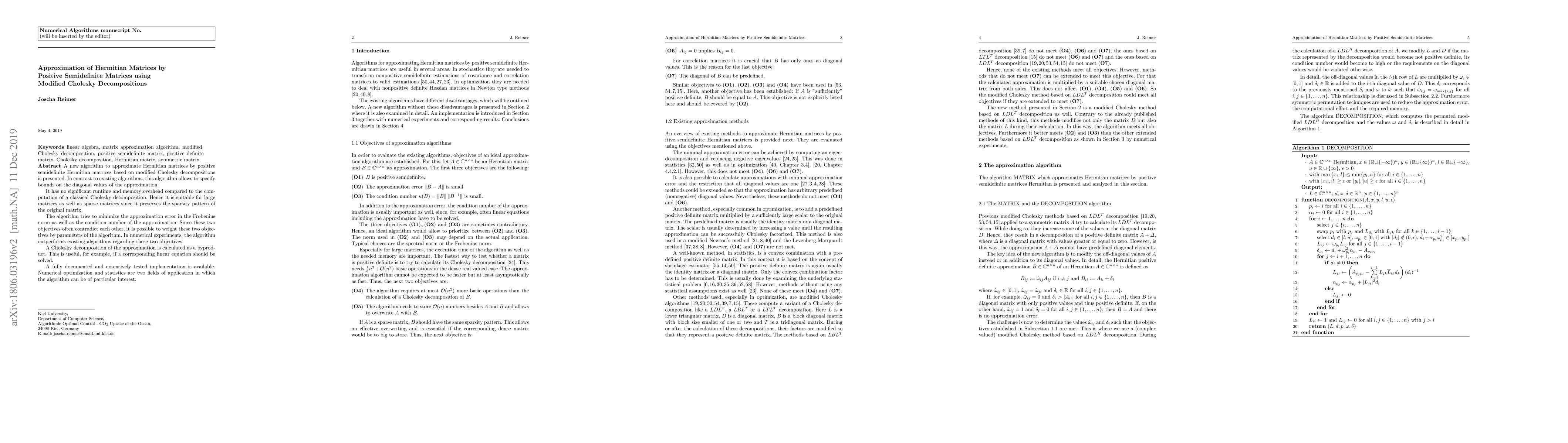 This paper introduces a novel algorithm for approximating Hermitian matrices by positive semidefinite matrices using modified Cholesky decompositions, allowing for specified diagonal bounds and minimizing both Frobenius norm error and condition number. The algorithm is efficient and preserves sparsity, making it suitable for large and sparse matrices.
