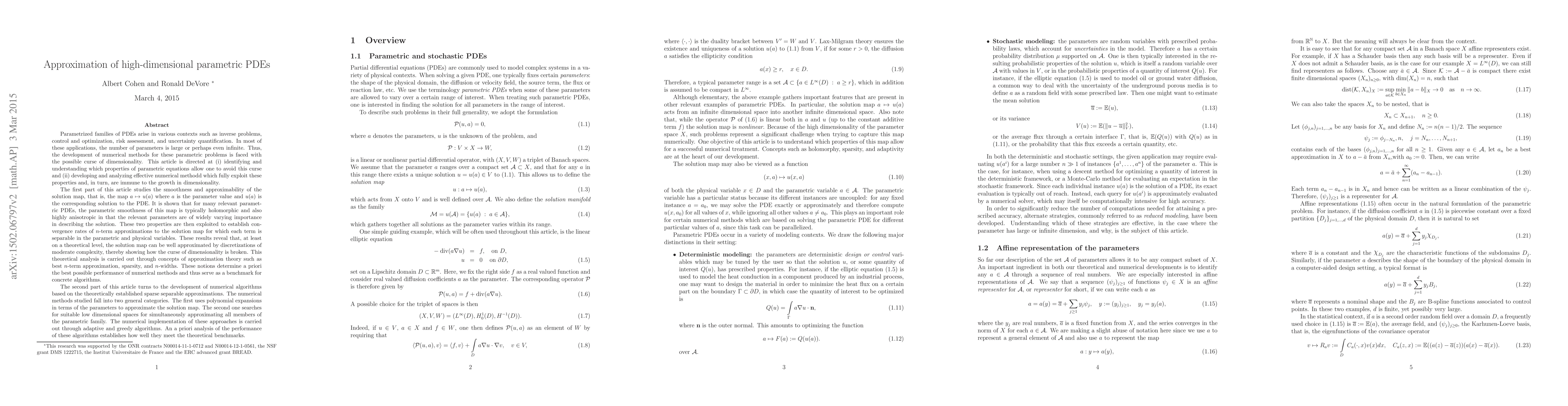 Parametrized families of PDEs arise in various contexts such as inverse problems, control and optimization, risk assessment, and uncertainty quantification. In most of these applications, the number of parameters is large or perhaps even infinite. Thus, the development of numerical methods for these parametric problems is faced with the possible curse of dimensionality. This article is directed at (i) identifying and understanding which properties of parametric equations allow one to avoid this curse and (ii) developing and analyzing effective numerical methodd which fully exploit these properties and, in turn, are immune to the growth in dimensionality. The first part of this article studies the smoothness and approximability of the solution map, that is, the map $a\mapsto u(a)$ where $a$ is the parameter value and $u(a)$ is the corresponding solution to the PDE. It is shown that for many relevant parametric PDEs, the parametric smoothness of this map is typically holomorphic and also highly anisotropic in that the relevant parameters are of widely varying importance in describing the solution. These two properties are then exploited to establish convergence rates of $n$-term approximations to the solution map for which each term is separable in the parametric and physical variables. These results reveal that, at least on a theoretical level, the solution map can be well approximated by discretizations of moderate complexity, thereby showing how the curse of dimensionality is broken. This theoretical analysis is carried out through concepts of approximation theory such as best $n$-term approximation, sparsity, and $n$-widths. These notions determine a priori the best possible performance of numerical methods and thus serve as a benchmark for concrete algorithms. The second part of this article turns to the development of numerical algorithms based on the theoretically established sparse separable approximations. The numerical methods studied fall into two general categories. The first uses polynomial expansions in terms of the parameters to approximate the solution map. The second one searches for suitable low dimensional spaces for simultaneously approximating all members of the parametric family. The numerical implementation of these approaches is carried out through adaptive and greedy algorithms. An a priori analysis of the performance of these algorithms establishes how well they meet the theoretical benchmarks.