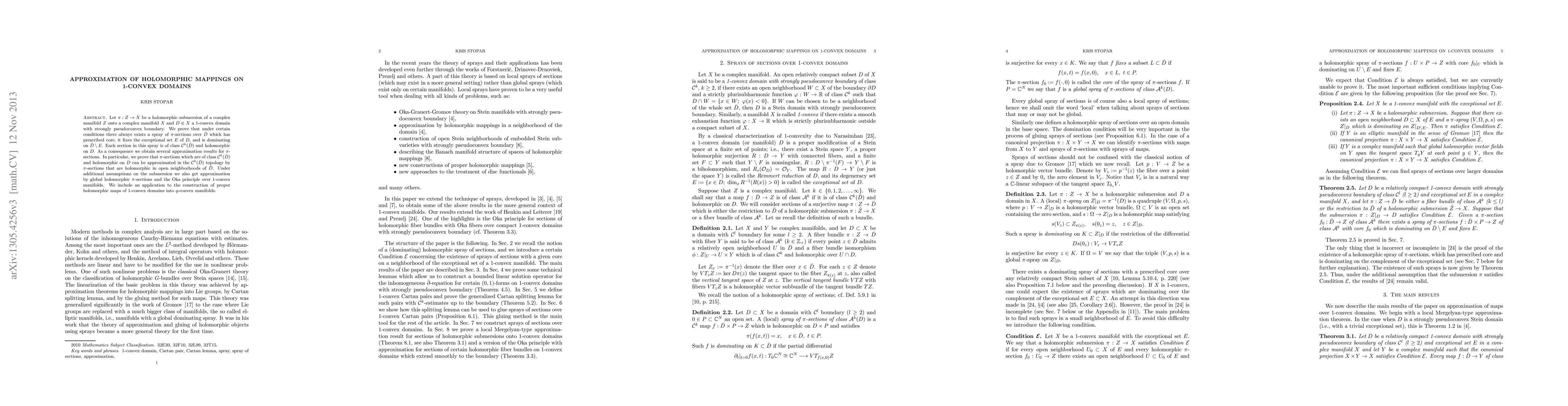 Let \pi :Z\to X be a holomorphic submersion of a complex manifold Z onto a complex manifold X and D\Subset X a 1-convex domain with strongly pseudoconvex boundary. We prove that under certain conditions there always exists a spray of \pi -sections over \bar{D} which has prescribed core, it fixes the exceptional set E of D, and is dominating on \bar{D}\setminus E. Each section in this spray is of class C^k(\bar{D}) and holomorphic on D. As a consequence we obtain several approximation results for \pi -sections. In particular, we prove that \pi -sections which are of class C^k(\bar{D}) and holomorphic on D can be approximated in the C^k(\bar{D}) topology by \pi -sections that are holomorphic in open neighborhoods of \bar{D}. Under additional assumptions on the submersion we also get approximation by global holomorphic \pi -sections and the Oka principle over 1-convex manifolds. We include an application to the construction of proper holomorphic maps of 1-convex domains into q-convex manifolds.