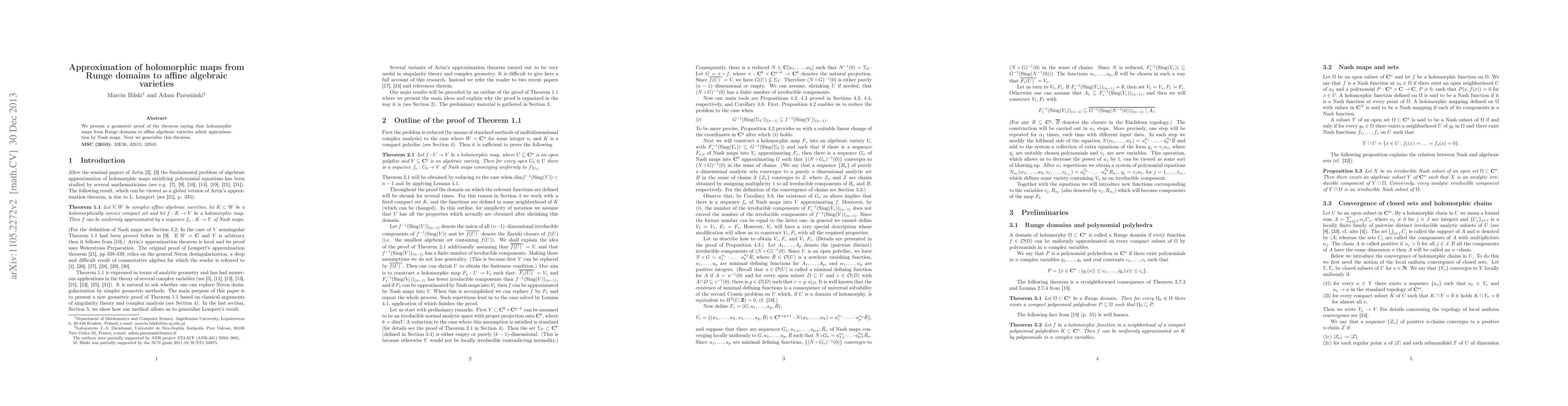 **Summary:** This paper provides a geometric proof for the approximation of holomorphic maps from Runge domains to affine algebraic varieties by Nash maps, followed by a generalization of this result.