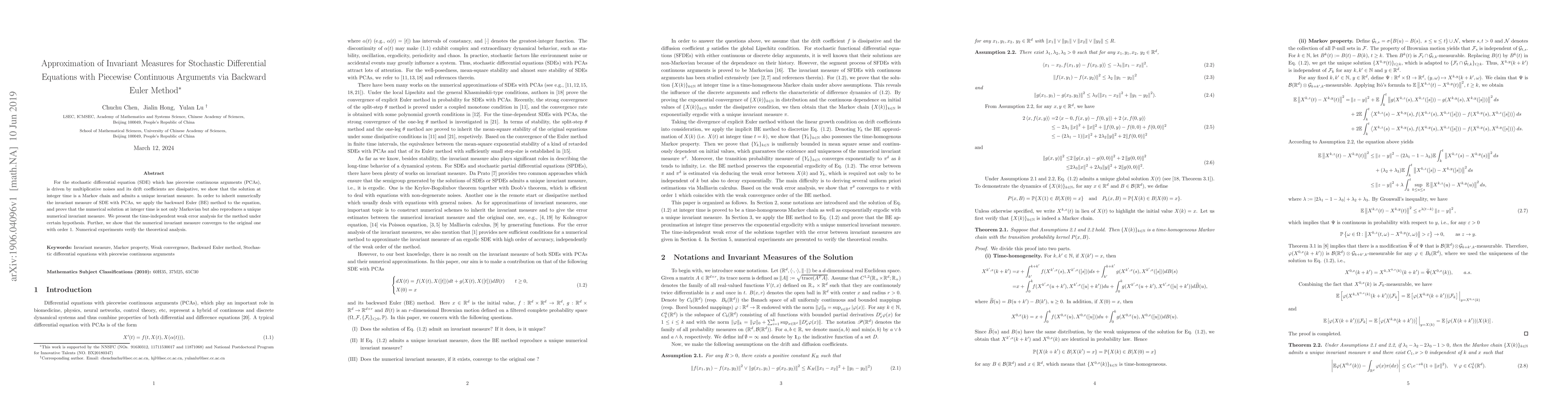 For the stochastic differential equation (SDE) which has piecewise continuous arguments (PCAs), is driven by multiplicative noises and its drift coefficients are dissipative, we show that the solution at integer time is a Markov chain and admits a unique invariant measure. In order to inherit numerically the invariant measure of SDE with PCAs, we apply the backward Euler (BE) method to the equation, and prove that the numerical solution at integer time is not only Markovian but also reproduces a unique numerical invariant measure. We present the time-independent weak error analysis for the method under certain hypothesis. Further, we show that the numerical invariant measure converges to the original one with order 1. Numerical experiments verify the theoretical analysis.