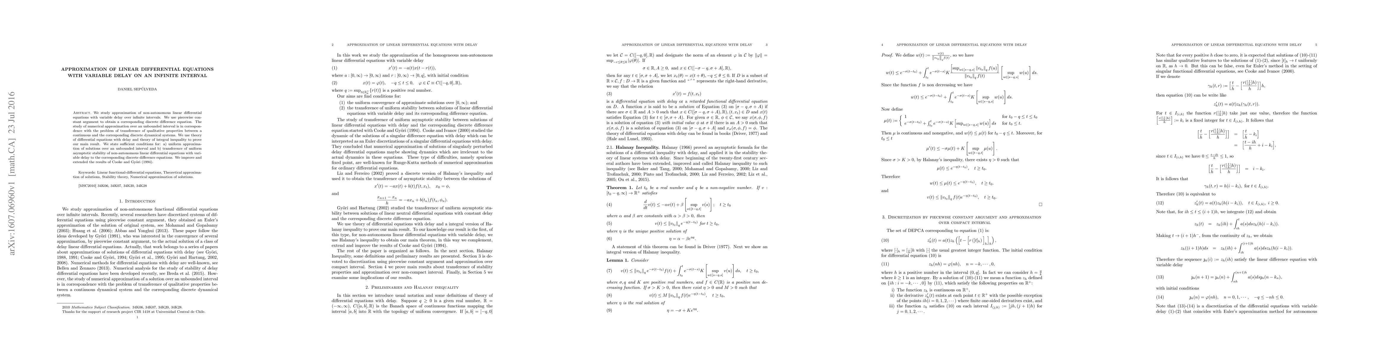 We study approximation of non-autonomous linear differential equations with variable delay over infinite intervals. We use piecewise constant argument to obtain a corresponding discrete difference equation. The study of numerical approximation over an unbounded interval is in correspondence with the problem of transference of qualitative properties between a continuous and the corresponding discrete dynamical systems. We use theory of differential equations with delay and theory of integral inequality to prove our main result. We state sufficient conditions for: a) uniform approximation of solutions over an unbounded interval and b) transference of uniform asymptotic stability of non-autonomous linear differential equations with variable delay to the corresponding discrete difference equations. We improve and extended the results of \cite{cooke1994}.