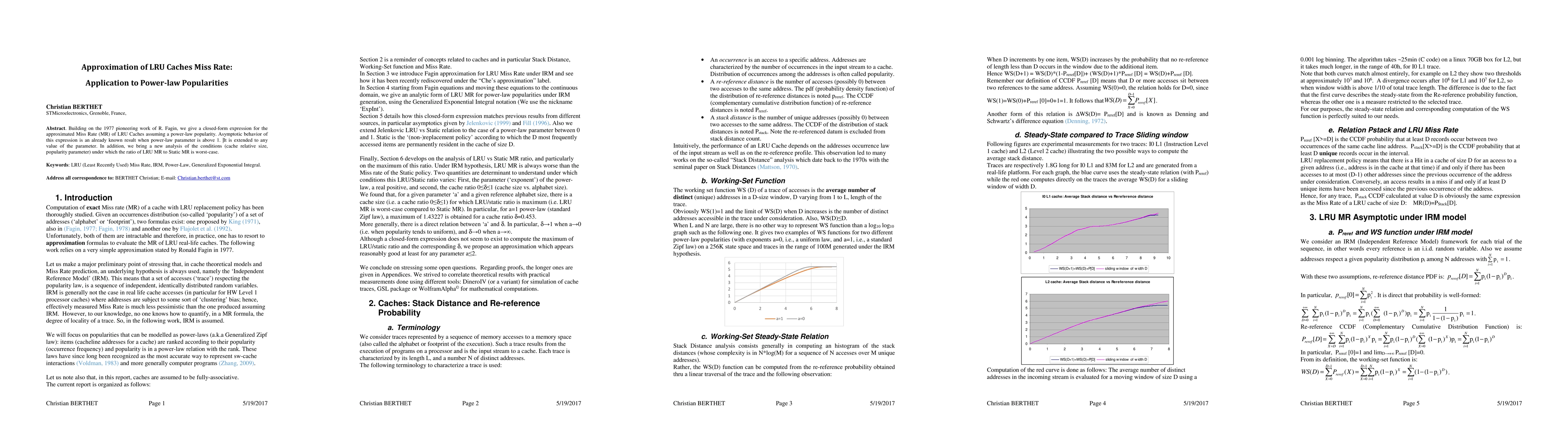 Building on the 1977 pioneering work of R. Fagin, we give a closed-form expression for the approximated Miss Rate (MR) of LRU Caches assuming a power-law popularity. Asymptotic behavior of this expression is an already known result when power-law parameter is above 1. It is extended to any value of the parameter. In addition, we bring a new analysis of the conditions (cache relative size, popularity parameter) under which the ratio of LRU MR to Static MR is worst-case.