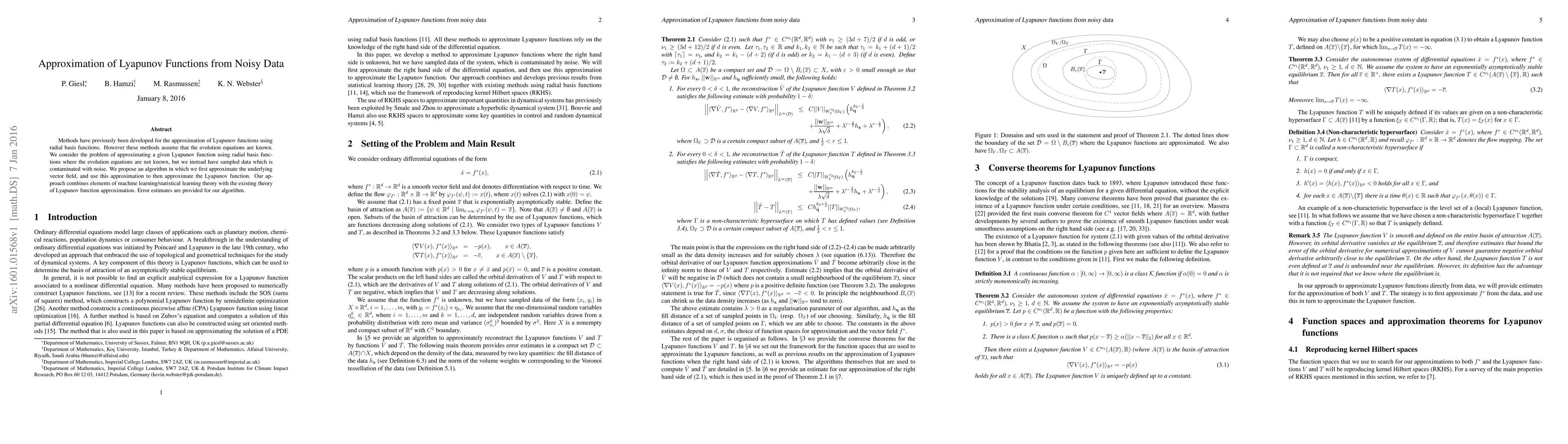This paper proposes an algorithm to approximate Lyapunov functions using radial basis functions from noisy sampled data when the underlying evolution equations are unknown. The method first estimates the vector field from the data, then uses this estimate to approximate the Lyapunov function, integrating machine learning with Lyapunov theory and providing error estimates.
