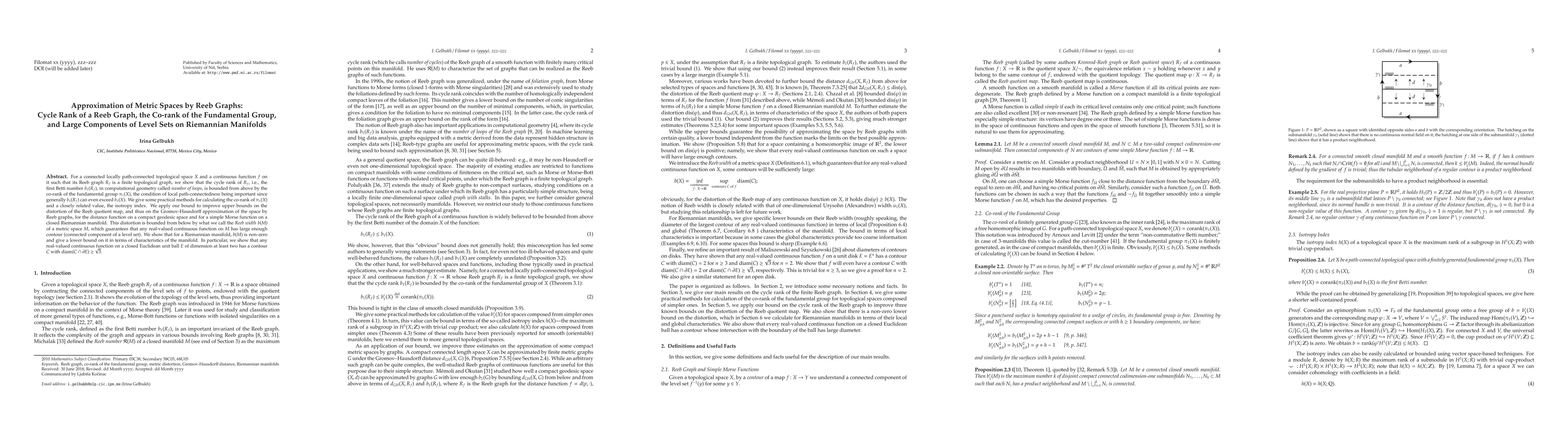 For a connected locally path-connected topological space $X$ and a continuous function $f$ on it such that its Reeb graph $R_f$ is a finite topological graph, we show that the cycle rank of $R_f$, i.e., the first Betti number $b_1(R_f)$, in computational geometry called \emph{number of loops}, is bounded from above by the co-rank of the fundamental group $\pi_1(X)$, the condition of local path-connectedness being important since generally $b_1(R_f)$ can even exceed $b_1(X)$. We give some practical methods for calculating the co-rank of $\pi_1(X)$ and a closely related value, the isotropy index. We apply our bound to improve upper bounds on the distortion of the Reeb quotient map, and thus on the Gromov-Hausdorff approximation of the space by Reeb graphs, for the distance function on a compact geodesic space and for a simple Morse function on a closed Riemannian manifold. This distortion is bounded from below by what we call the Reeb width $b(M)$ of a metric space $M$, which guarantees that any real-valued continuous function on $M$ has large enough contour (connected component of a level set). We show that for a Riemannian manifold, $b(M)$ is non-zero and give a lower bound on it in terms of characteristics of the manifold. In particular, we show that any real-valued continuous function on a closed Euclidean unit ball $E$ of dimension at least two has a contour $C$ with $diam(C\cap\partial E)\ge\sqrt3$.