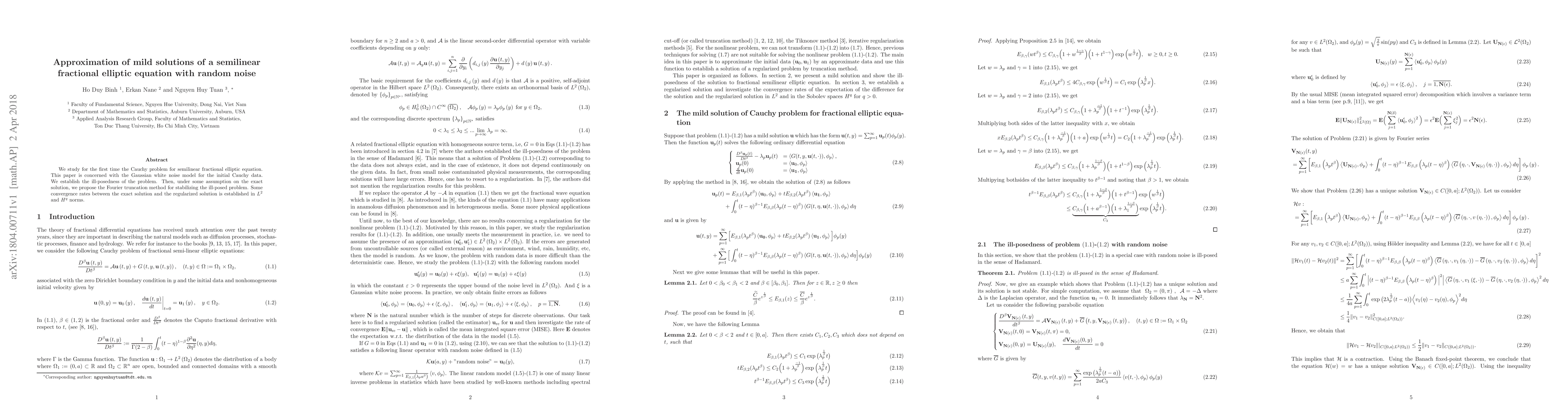 Researchers study the Cauchy problem for semilinear fractional elliptic equations with random noise, establishing its ill-posedness and proposing a method to stabilize it through Fourier truncation.