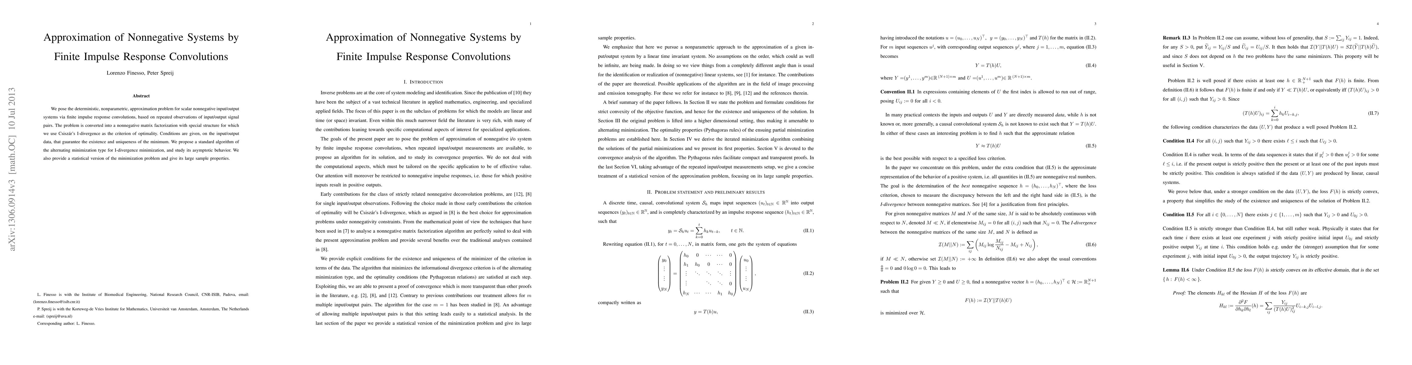 This paper proposes a new method for approximating nonnegative systems using finite impulse response convolutions, based on minimizing the I-divergence criterion. The approach uses alternating minimization to find the optimal approximation from repeated observations of input/output signal pairs.