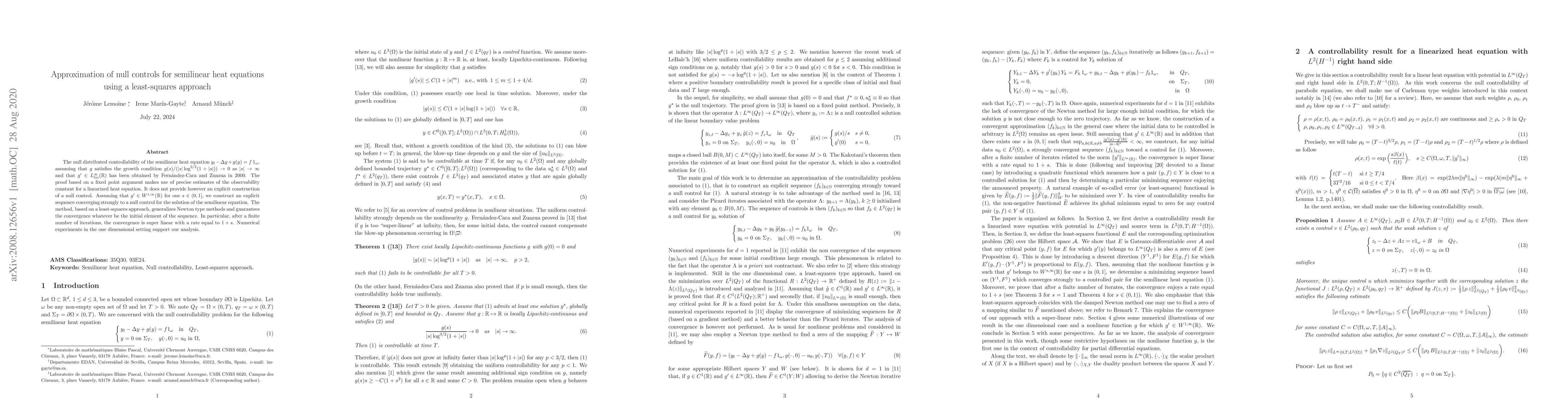 The null distributed controllability of the semilinear heat equation $y_t-\Delta y + g(y)=f \,1_{\omega}$, assuming that $g$ satisfies the growth condition $g(s)/(\vert s\vert \log^{3/2}(1+\vert s\vert))\rightarrow 0$ as $\vert s\vert \rightarrow \infty$ and that $g^\prime\in L^\infty_{loc}(\mathbb{R})$ has been obtained by Fern\'andez-Cara and Zuazua in 2000. The proof based on a fixed point argument makes use of precise estimates of the observability constant for a linearized heat equation. It does not provide however an explicit construction of a null control. Assuming that $g^\prime\in W^{s,\infty}(\mathbb{R})$ for one $s\in (0,1]$, we construct an explicit sequence converging strongly to a null control for the solution of the semilinear equation. The method, based on a least-squares approach, generalizes Newton type methods and guarantees the convergence whatever be the initial element of the sequence. In particular, after a finite number of iterations, the convergence is super linear with a rate equal to $1+s$. Numerical experiments in the one dimensional setting support our analysis.
