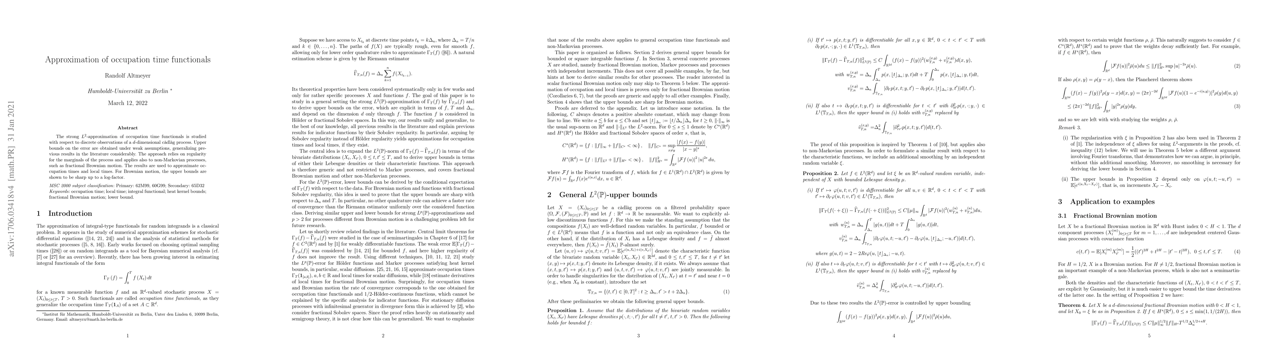 The strong $L^2$-approximation of occupation time functionals is studied with respect to discrete observations of a $d$-dimensional c\`adl\`ag process. Upper bounds on the error are obtained under weak assumptions, generalizing previous results in the literature considerably. The approach relies on regularity for the marginals of the process and applies also to non-Markovian processes, such as fractional Brownian motion. The results are used to approximate occupation times and local times. For Brownian motion, the upper bounds are shown to be sharp up to a log-factor.