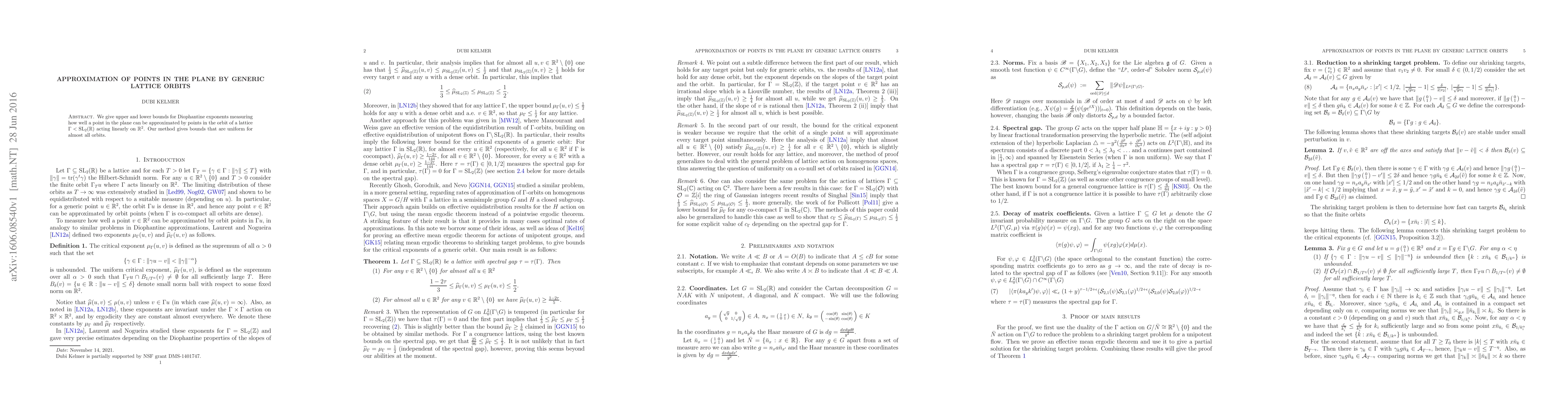We give upper and lower bounds for Diophantine exponents measuring how well a point in the plane can be approximated by points in the orbit of a lattice $\Gamma<\mathrm{SL}_2(\mathbb{R})$ acting linearly on $\mathbb{R}^2$. Our method gives bounds that are uniform for almost all orbits.