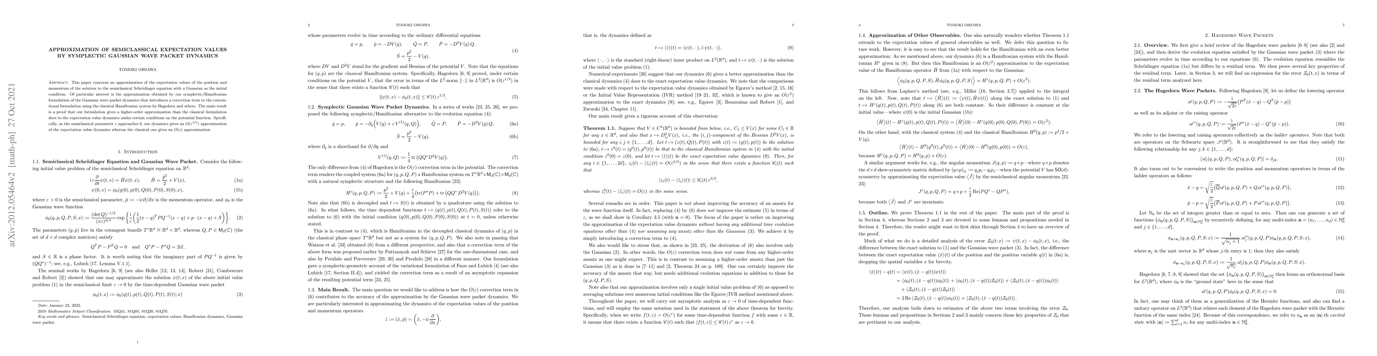 This paper proposes a symplectic Gaussian wave packet dynamics to approximate the expectation values of position and momentum in semiclassical Schrödinger equations, achieving a higher-order $O(\varepsilon^{3/2})$ approximation compared to the classical $O(\varepsilon)$ approximation as $\varepsilon$ approaches $0$.