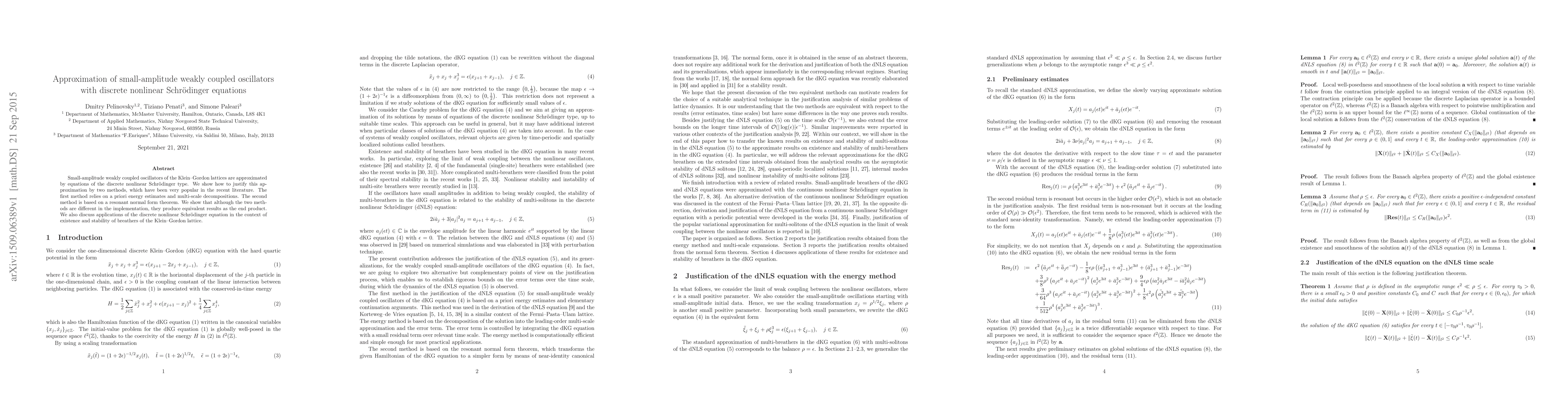Researchers approximate small-amplitude oscillators using discrete nonlinear Schrodinger equations, justifying the approximation through two different methods that yield equivalent results, with implications for understanding breathers in Klein-Gordon lattices.