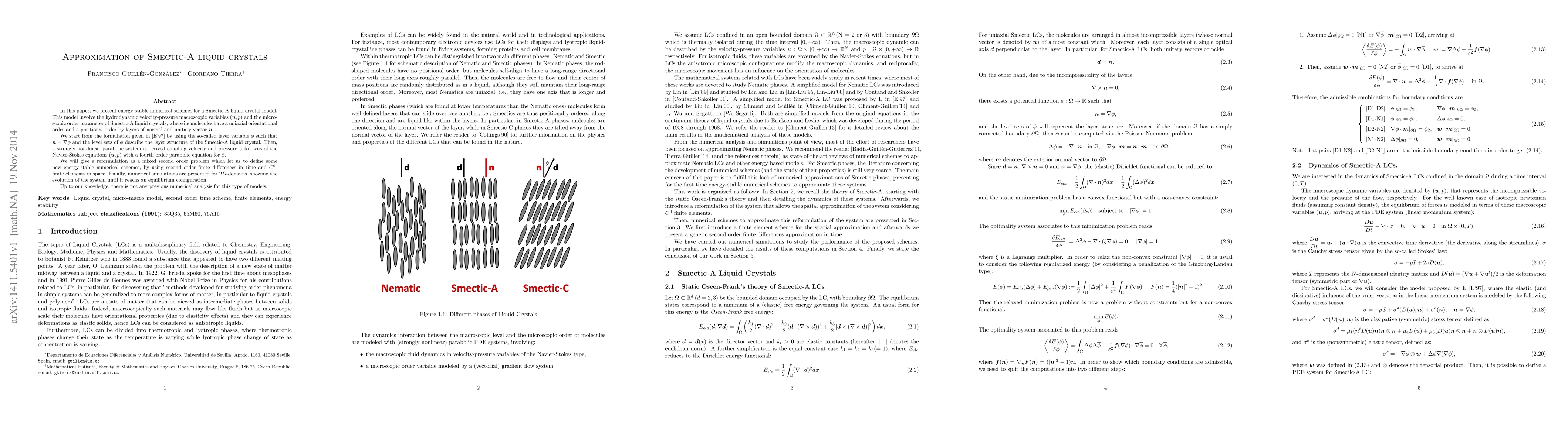 This paper develops energy-stable numerical schemes for a model of Smectic-A liquid crystals, coupling hydrodynamic variables with a fourth-order parabolic equation for the layer structure. The new schemes employ second-order finite differences and $C^0$-finite elements, with numerical simulations demonstrating system evolution to equilibrium.