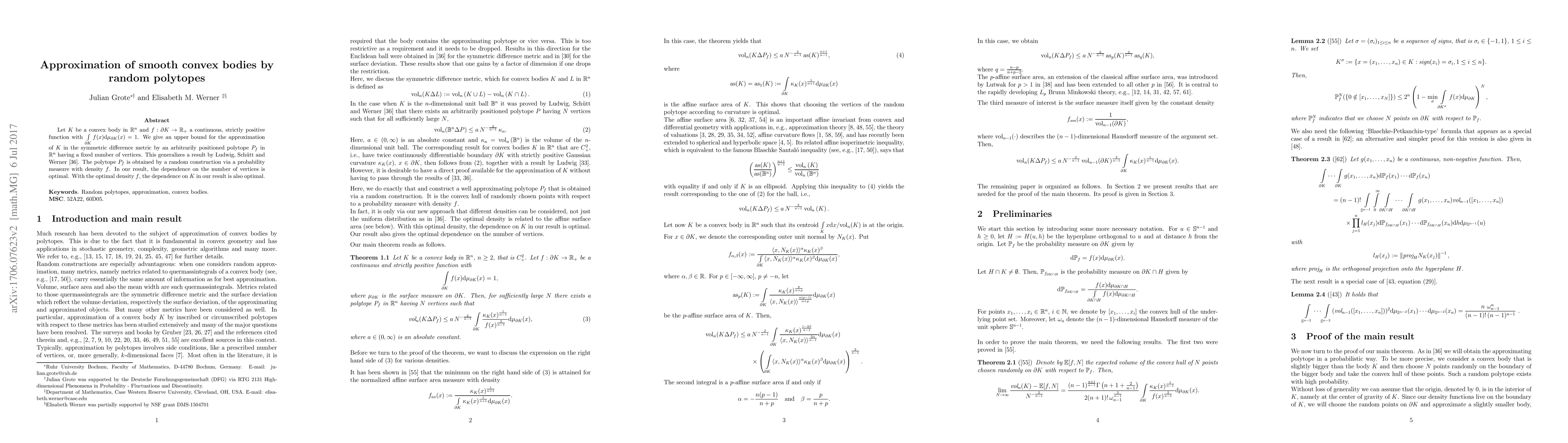 This paper provides an upper bound for the approximation of a smooth convex body $K$ in $\mathbb{R}^n$ by a random polytope $P_f$ with a fixed number of vertices, using the symmetric difference metric. The result generalizes previous work and shows optimal dependence on the number of vertices and the convex body $K$.