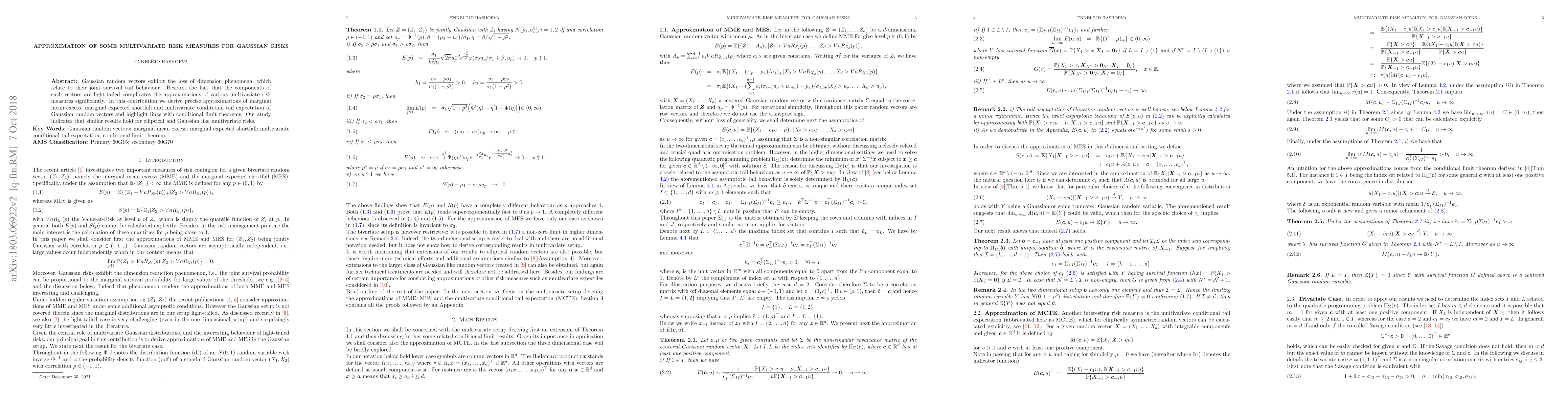 Gaussian random vectors exhibit the loss of dimension phenomena, which relate to their joint survival tail behaviour. Besides, the fact that the components of such vectors are light-tailed complicates the approximations of various multivariate risk measures significantly. In this contribution we derive precise approximations of marginal mean excess, marginal expected shortfall and multivariate conditional tail expectation of Gaussian random vectors and highlight links with conditional limit theorems. Our study indicates that similar results hold for elliptical and Gaussian like multivariate risks.