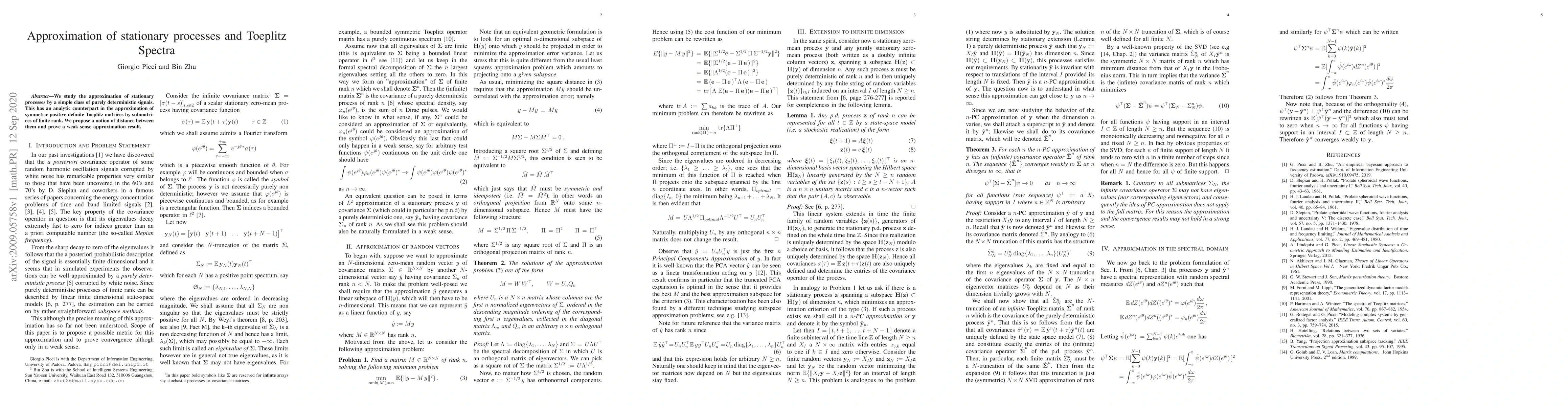 We study the approximation of stationary processes by a simple class of purely deterministic signals. This has an analytic counterpart in the approximation of symmetric positive definite Toeplitz matrices by submatrices of finite rank. We propose a notion of distance between them and prove a weak sense approximation result.