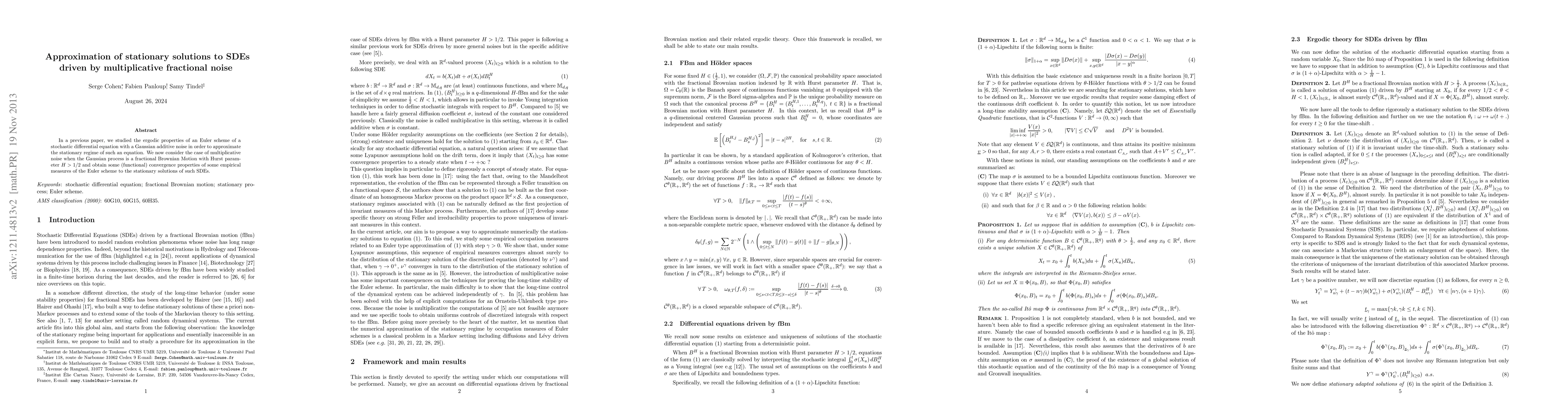 Summary: This paper investigates the approximation of stationary solutions for stochastic differential equations driven by multiplicative fractional noise, focusing on the convergence properties of an Euler scheme and the behavior of empirical measures in relation to the stationary solutions.